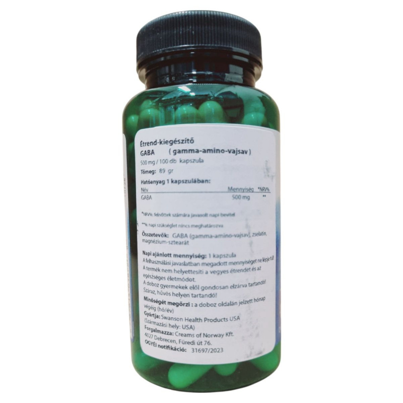 A Swanson GABA étrend-kiegészítő kapszula formájában kínálja a gamma-amino-vajsavat, amely egy fontos neurotranszmitter lehet az idegrendszer számára. A termék napi ajánlott adagja egy kapszula, amely 500 mg GABA-t tartalmaz. Az összetevők között szerepel a zselatin és a magnézium-sztearát is. A termék nem helyettesíti a vegyes étrendet és az egészséges életmódot, és gyermekek elől elzárva tartandó. A Swanson Health Products által gyártott terméket a Creams of Norway Kft. forgalmazza Magyarországon.