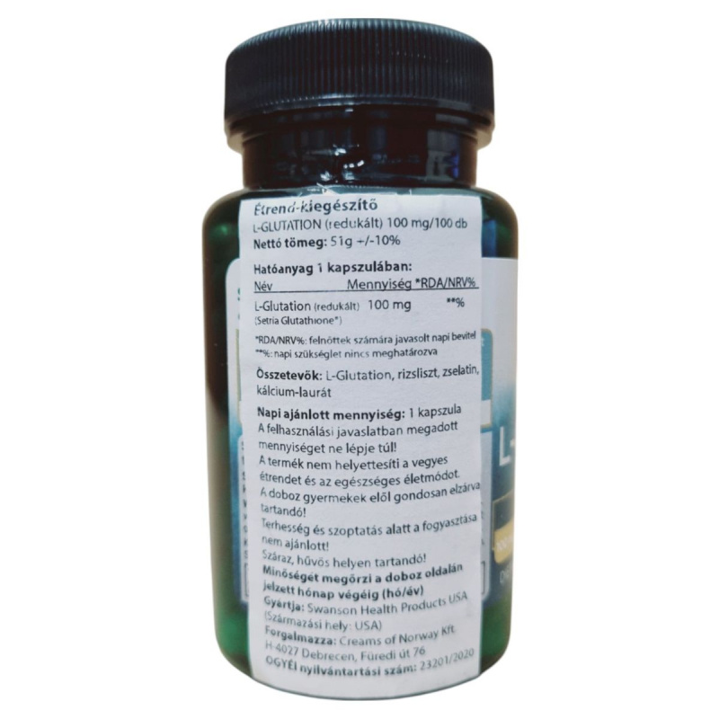 Az L-Glutation (redukált) étrend-kiegészítő a Swanson Health Products által gyártott termék, amely kapszulánként 100 mg L-Glutationt tartalmaz. A termék célja, hogy támogassa a szervezet antioxidáns védelmét. Az összetevők között megtalálható a rizsliszt, zselatin és kalcium-laurát. A termék használata során fontos betartani az ajánlott napi mennyiséget, és figyelembe venni a figyelmeztetéseket, különösen terhesség és szoptatás alatt. A terméket száraz, hűvös helyen kell tárolni, és gyermekek elől elzárva tartani. A forgalmazó a Creams of Norway Kft, Debrecenben található.