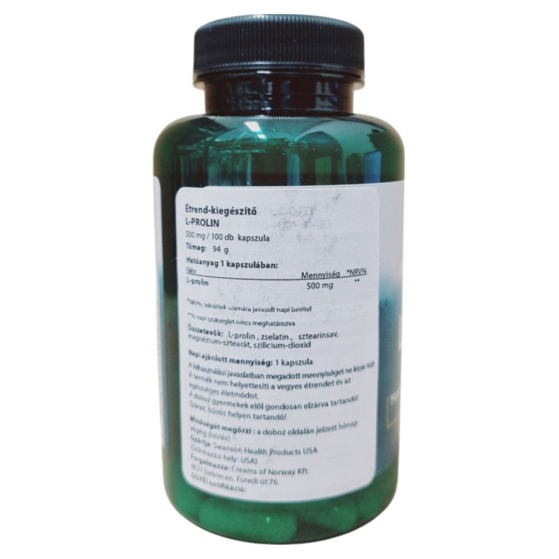 Az L-PROLIN étrend-kiegészítő kapszula 500 mg L-prolint tartalmaz, amely egy fontos aminosav lehet a szervezet számára. A terméket a Swanson Health Products gyártja az USA-ban, és a Creams of Norway Kft. forgalmazza Magyarországon. A kapszulák zselatinból készülnek, és további összetevőket tartalmaznak, mint a sztearinsav, magnézium-sztearát és szilícium-dioxid. Az ajánlott napi adag 1 kapszula, amelyet nem szabad túllépni. A termék nem helyettesíti a változatos étrendet és az egészséges életmódot. Fontos, hogy a dobozt gyermekek elől elzárva, száraz és hűvös helyen tároljuk.