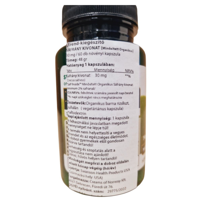 A Swanson Sáfrány Kivonat egy minősített organikus étrend-kiegészítő, amely 60 növényi kapszulát tartalmaz. A termék fő hatóanyaga a Crocus sativus növényből származó sáfrány kivonat, amely minimum 2% safranalt biztosít. Az organikus barna rizsliszt és a vegetáriánus kapszula biztosítja a termék természetes összetételét. A termék használata során fontos, hogy a napi ajánlott mennyiséget ne lépje túl, és terhesség vagy szoptatás alatt kerülje a fogyasztását. A terméket száraz, hűvös helyen kell tárolni, és gyermekek elől elzárva tartani. A Swanson Health Products által gyártott termék forgalmazója a Creams of Norway Kft., Debrecenben.
