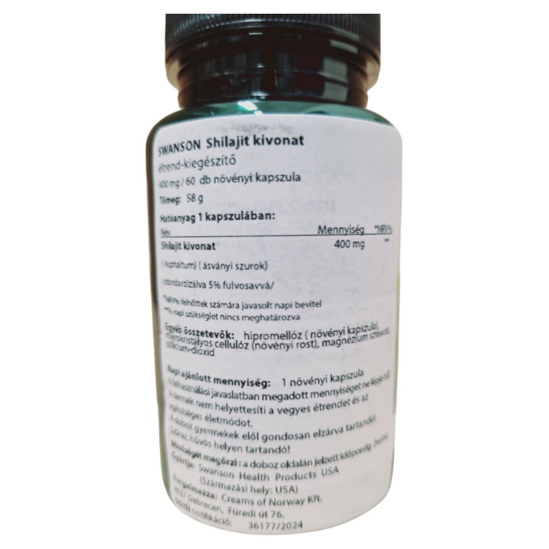 A SWANSON Shilajit kivonat egy étrend-kiegészítő, amely 400 mg shilajit kivonatot tartalmaz kapszulánként, és standardizálva van 5% fulvosavvá. A termék hipromellóz alapú növényi kapszulában érkezik, amely mikrokristályos cellulózt, magnézium-sztearátot és szilícium-dioxidot is tartalmaz. A napi ajánlott adag 1 kapszula, amely segíthet az általános jólét és vitalitás támogatásában. Fontos, hogy a termék nem helyettesíti a vegyes étrendet és az egészséges életmódot. Gyermekek elől elzárva, száraz, hűvös helyen tárolandó. A terméket a Swanson Health Products gyártja, és az OGYÉI notifikációs száma 36177/2024.