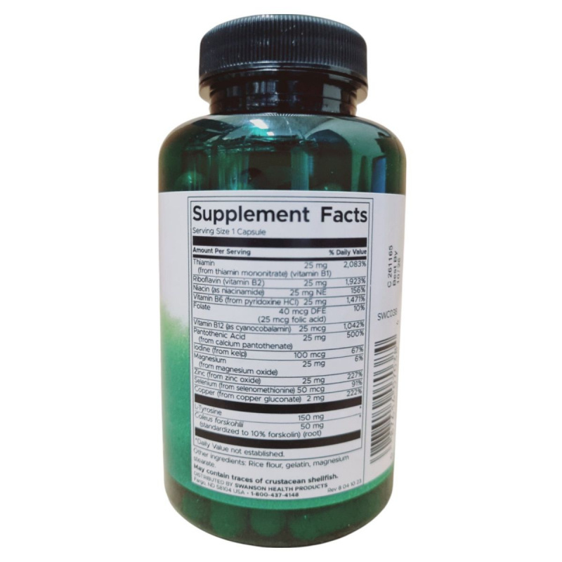 A Thyroid Essentials étrend-kiegészítő kapszula a Swanson Health Products kínálatából származik, és 90 kapszulát tartalmaz. A termék különféle B-vitaminokat, ásványi anyagokat, mint például jód, cink és szelén, valamint növényi kivonatokat tartalmaz, amelyek hozzájárulhatnak a pajzsmirigy egészségének támogatásához. A termék napi ajánlott adagja 1 kapszula, amelyet nem szabad túllépni. A termék nem helyettesíti a vegyes étrendet és az egészséges életmódot, és terhesség, valamint szoptatás alatt nem ajánlott a fogyasztása. A kapszulák rizslisztet, zselatint és magnézium-sztearátot tartalmaznak, és nyomokban tartalmazhatnak rákféléket. A terméket száraz, hűvös helyen kell tárolni, és gyermekek elől elzárva tartani.