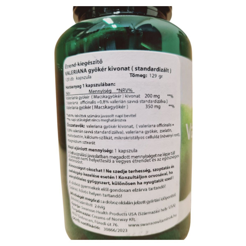 A Swanson VALERIANA gyökér kivonat kapszula egy étrend-kiegészítő, amely valeriana gyökér kivonatot tartalmaz, standardizálva 0,8% valerián savra. A termék célja, hogy támogassa a relaxációt és hozzájáruljon a nyugodt alváshoz. A napi ajánlott mennyiség 1 kapszula, amelyet nem szabad túllépni. A termék álmosságot okozhat, ezért nem ajánlott terhesség, szoptatás alatt, valamint nehézgép kezelése esetén. A terméket száraz, hűvös helyen kell tárolni, és gyermekek elől elzárva tartani. A forgalmazó a Swanson Health Products, a termék származási helye az USA.