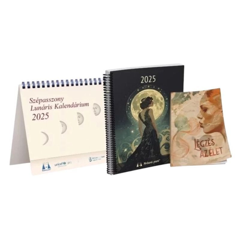 A Szépasszony lunáris kalendárium 2025 a következőket tartalmazza: Asztali naptár, Határidőnapló rengeteg értékes információval, Kártyanaptár, Légzés az élet című füzet, Híres idézetekkel ellátott könyvjelző.