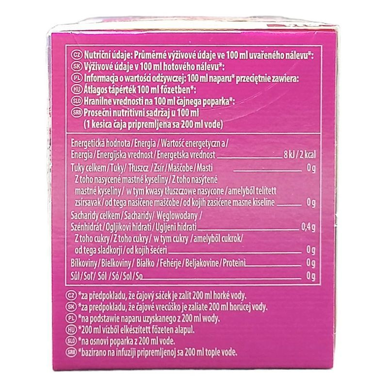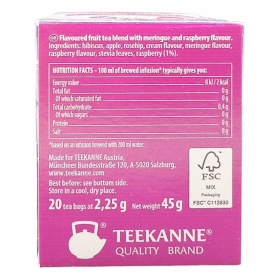 Összetevők: gyümölcstea keverék (alma, hibiszkusz, málna, szeder, ízesítő), habcsók íz.