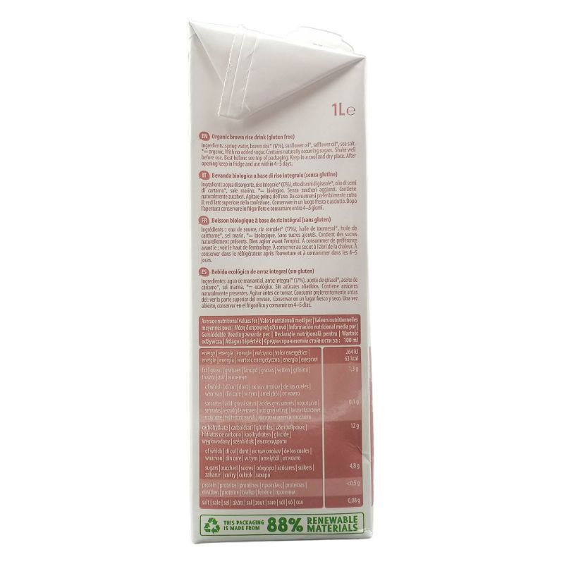 Tápanyag tartalom: Energia 264 kJ, 63 kcal, Zsír 1,3 g, amelyből telített zsírsavak 0,1 g, Szénhidrát 12 g, amelyből cukor 4,8 g, Fehérje <0,5 g , Só 0,08 g. Összetevők: Forrásvíz, olasz barna rizs* (17%), napraforgó olaj*, pórsáfrány olaj*, só. *=ökológiai. Hozzáadott cukor nélkül. Természetes cukrokat tartalmaz.