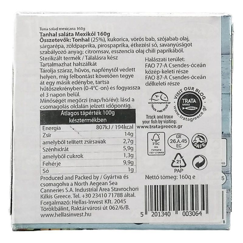Összetevők: 25% tonhal, kukorica, vörös bab, szójaolaj, sárgarépa, zöld paprika, piros paprika, főzősó, savanyúságot szabályzó anyagok: citromsav , chili paprika olaj eszencia.