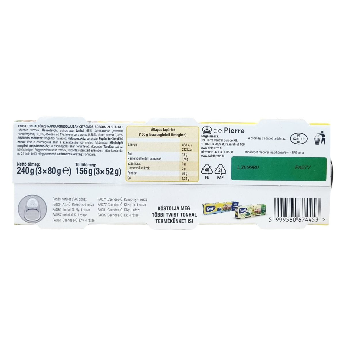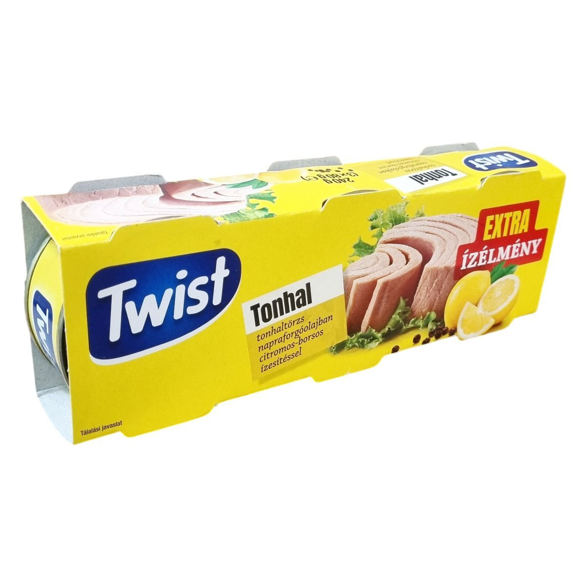 A Twist márka citromos-borsos ízesítésű tonhaltörzse napraforgóolajban egy hőkezelt, minőségi tengeri eredetű termék. Az összetevők között 65% csíkoshasú tonhal található, továbbá 33,6% napraforgóolaj, valamint só és aromák. A halászat vonóhálóval történik, a fogási terület FAO-zónája megtalálható a csomagoláson. A nettó tömeg 240 g, a töltőtömeg 156 g. A csomag három 80 g-os adagból áll. A termék származási országa Portugália.
