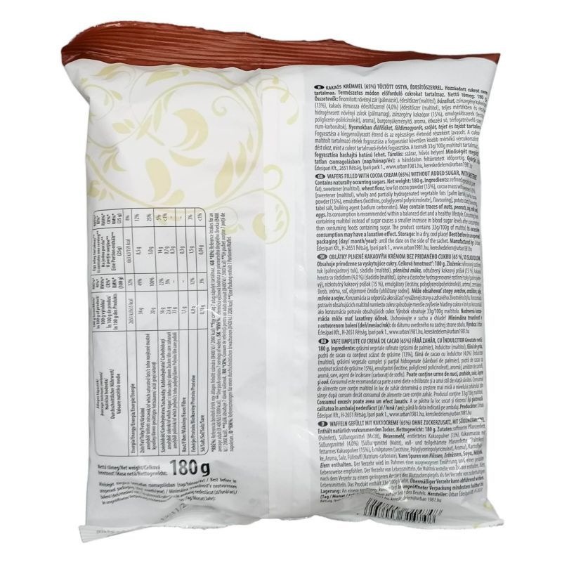 Összetevők: finomított növényi zsír (pálmazsír), édesítőszer (maltitol), búzaliszt, zsírszegény kakaópor (13%), kakaós étmassza édesítőszerrel (4,0%) [édesítőszer (maltitol), teljes mértékben és részben hidrogénezett növényi zsírok (pálmamag), zsírszegény kakaópor (15%), emulgeálószerek (lecitinek, poliglicerin-poliricinoleát), aroma], burgonyakeményítő, aroma, étkezési só, térfogatnövelő szer (nátrium-karbonátok).