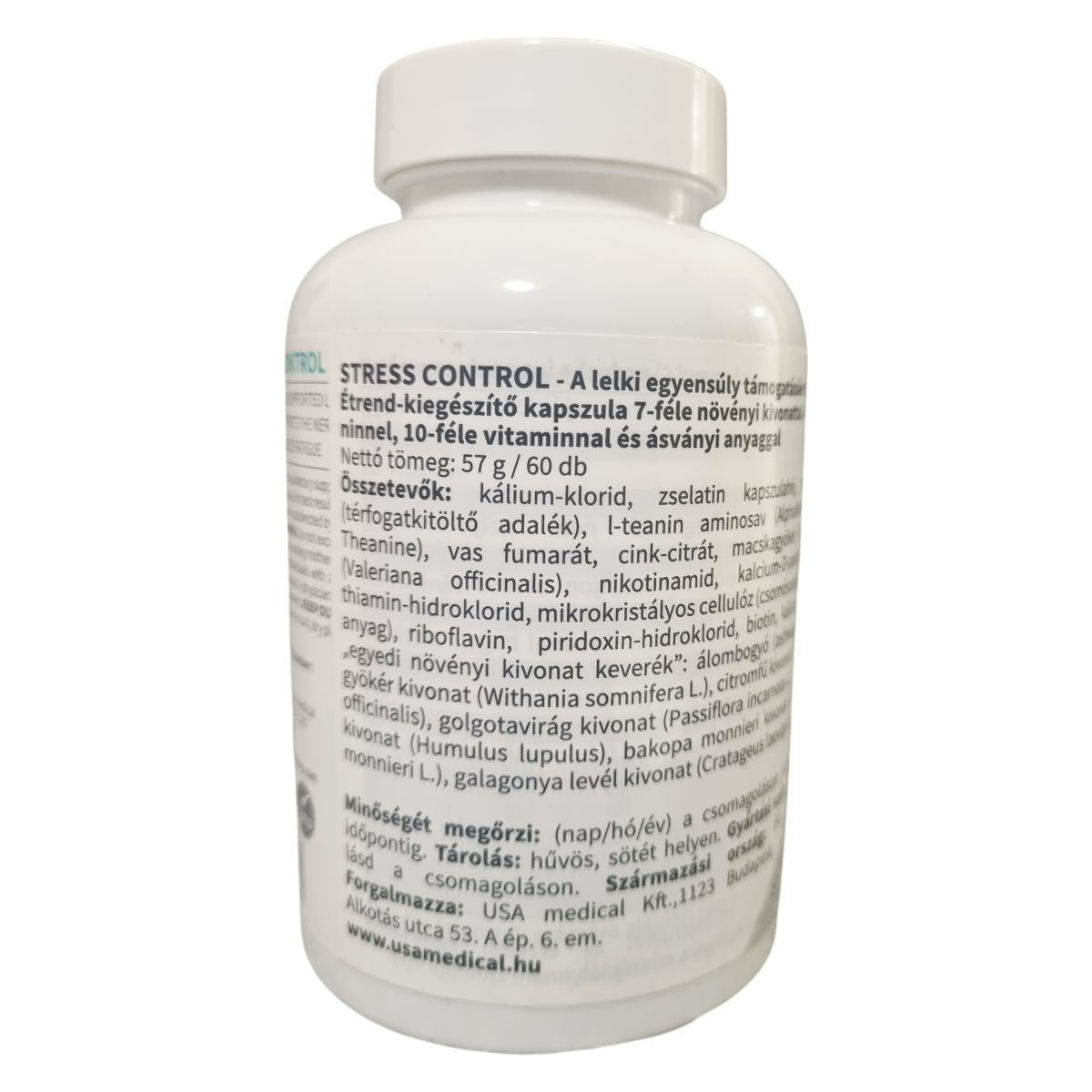 Stress Control – A lelki egyensúly támogatásáért! Étrend-kiegészítő kapszula 7-féle növényi kivonattal, l-teaninnel, 10-féle vitaminnal és ásványi anyaggal. Nettó tömeg: 57 g / 60 db.