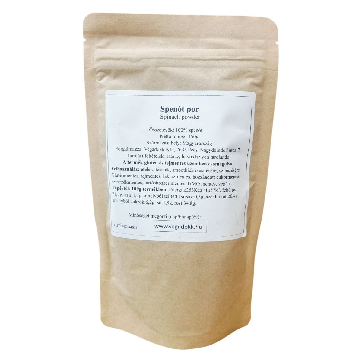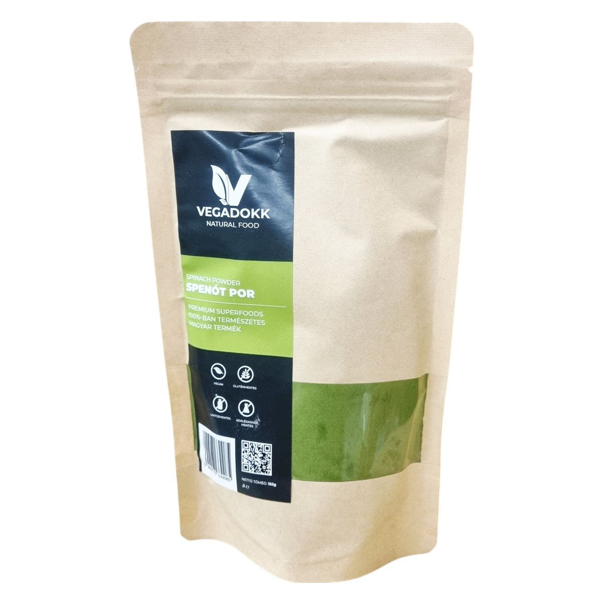 A Vegadokk spenót por egy 100%-ban természetes, magyar termék, amely prémium minőségű superfoodként készül. A termék vegán, gluténmentes, laktózmentes, valamint nem tartalmaz hozzáadott cukrot, színezéket, tartósítószert és GMO-t. Felhasználása sokoldalú, alkalmas ételek, tészták és smoothie-ok ízesítésére és színezésére. A csomagolás megfelelhet a glutén- és tejmentesség követelményeinek, így érzékenyek is fogyaszthatják.