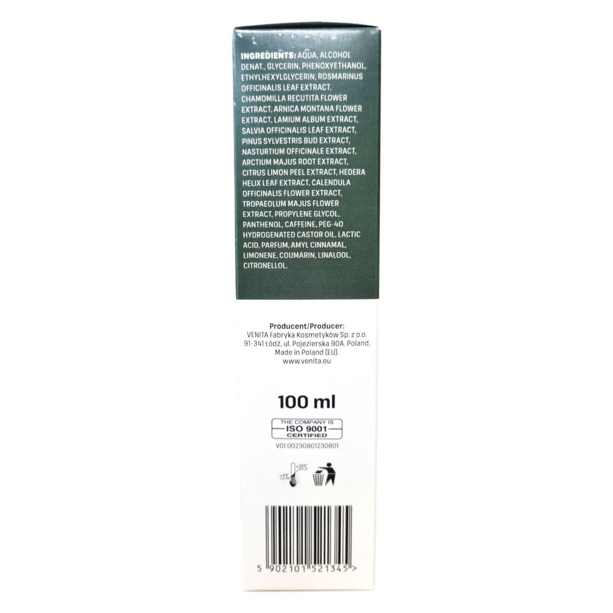 Aqua, Alcohol Denat., Glycerin, Phenoxyethanol, Ethylhexylglycerin, Rosmarinus Officinalis Leaf Extract, Chamomilla Recutita Flower Extract, Arnica Montana Flower Extract, Lamium Album Extract, Salvia Officinalis Leaf Extract, Pinus Sylvestris Bud Extract, Nasturtium Officinale Extract, Arctium Majus Root Extract, Citrus Limon Peel Extract, Hedera Helix Leaf Extract, Calendula Officinalis Flower Extract, Tropaeolum Majus Flower Extract, Propylene Glycol, Panthenol, Caffeine, PEG-40 Hydrogenated Castor Oil, Lactic Acid, Parfum, Amyl Cinnamal, Limonene, Coumarin, Linalool, Citronellol.