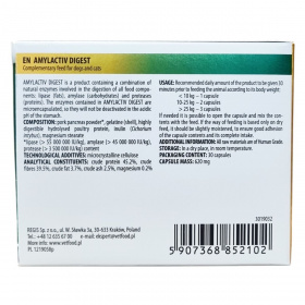 Az Amylactiv Digest természetes enzimek kombinációját tartalmazza (lipáz, amiláz, proteáz), amelyek támogathatják a zsírok, szénhidrátok és fehérjék emésztését. Az enzimeket védett, mikrokapszulázott formában tartalmazza, így azok a gyomor savas közegében nem inaktiválódnak. Szükség szerint a kapszula felnyitható és tartalma az eleséghez keverhető. Ha az állat száraz tápot kap, érdemes azt enyhén megnedvesíteni a kapszula tartalmának megfelelő tapadása érdekében. Minden alapanyag emberi fogyasztásra alkalmas minősítésű.