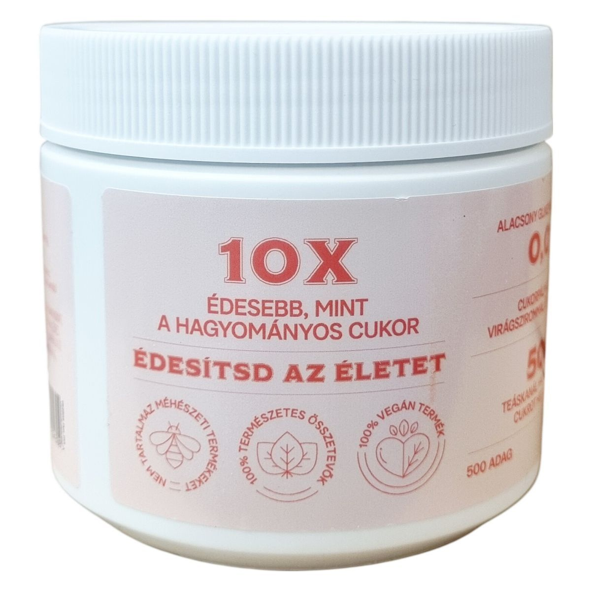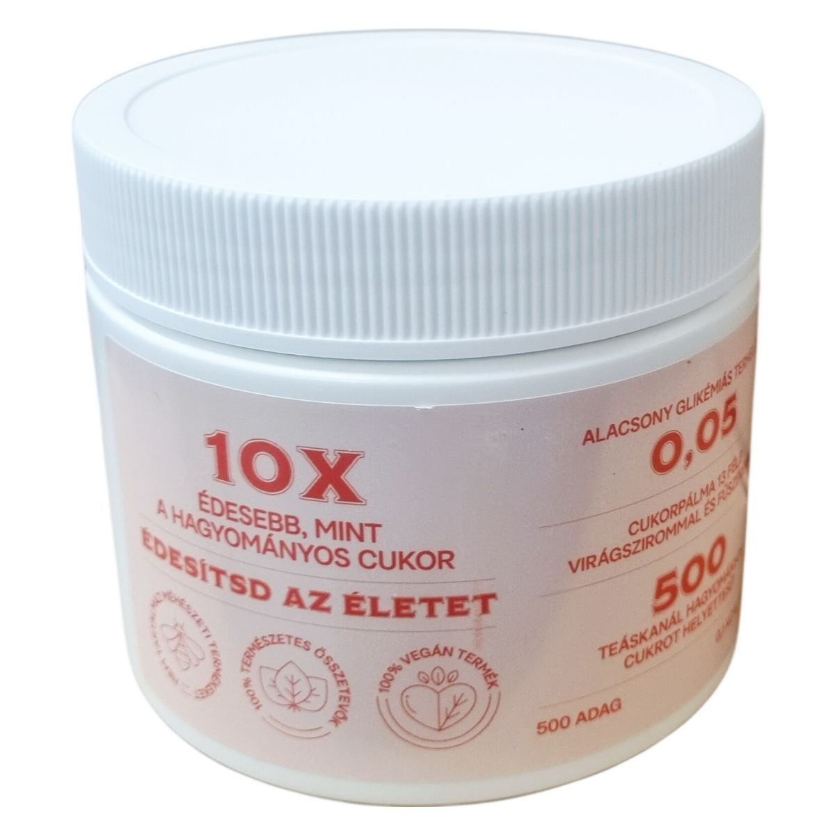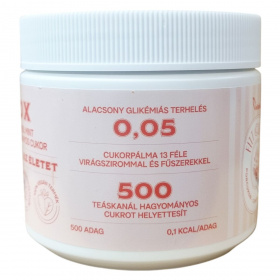 Fitt porcukor, alacsony kalóriatartalmú cukorhelyettesítő. 10x édesebb, mint a hagyományos cukor. Nem tartalmaz méhészeti terméket. 100% természetes összetevők. 100% vegán termék. Alacsony glikémiás terhelés: 0,05. Cukorpálma 13 féle virágszirommal és fűszerekkel. 500 teáskanál hagyományos cukrot helyettesít. 500 adag, 0,1 kcal/adag. Minőségét megőrzi a doboz alján jelzett időpontig (nap/hó/év). Nettó tömeg: 250 g.
