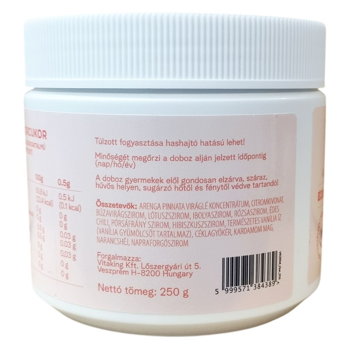 Arenga pinnata viráglé koncentrátum, citromkivonat, búzavirágszirom, lótuszszirom, ibolyaszirom, rózsaszirom, édes chili, pórsáfrány szirom, hibiszkuszszirom, természetes vanília íz (vanília gyümölcsöt tartalmaz), céklagyökér, kardamom mag, narancshéj, napraforgószirom
