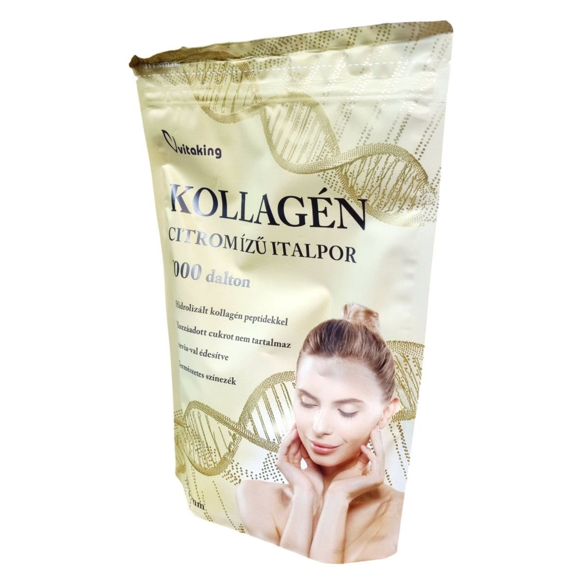 A Vitaking KOLLAGÉN citrom ízű italpor egy speciális étrend-kiegészítő, amely hidrolizált kollagén peptideket tartalmaz. A termék steviával édesített, hozzáadott cukrot nem tartalmaz, és természetes színezéket tartalmaz. A C-vitamin tartalma hozzájárulhat a normál kollagénképződéshez, amely támogathatja az erek, a csontok, a porcok, a fogíny, a bőr és a fogak normál állapotának fenntartását. A termék tej, tojás, glutén, szója, földimogyoró, mogyoró, hal és rákféle összetevőket feldolgozó üzemben készült.
