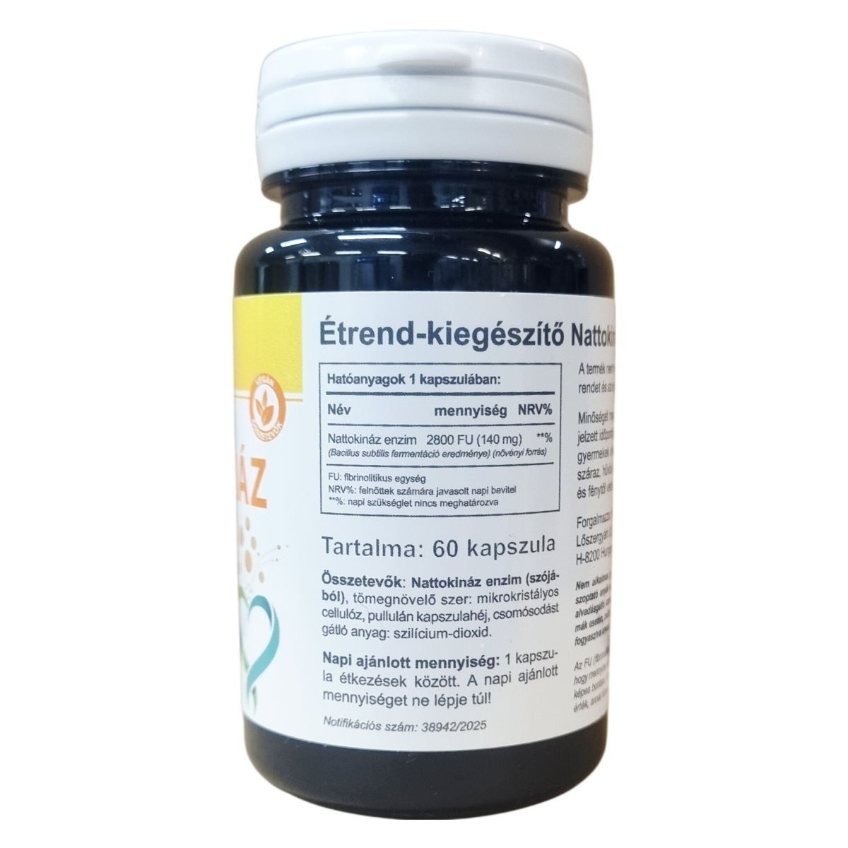 Étrend-kiegészítő nattokináz enzimmel, amely Bacillus subtilis fermentáció eredménye, növényi forrásból. Az FU (fibrinolitikus egység) azt mutatja meg, hogy mennyire aktív az enzim és mennyi fibrint képes bontani. Minél magasabb az érték, annál több. Tartalma: 60 vegán kapszula.