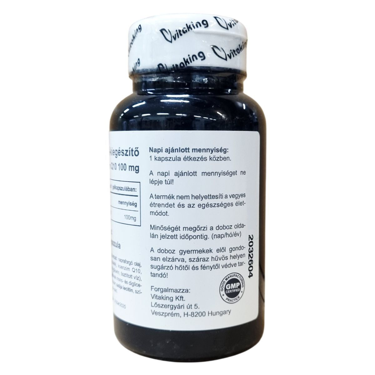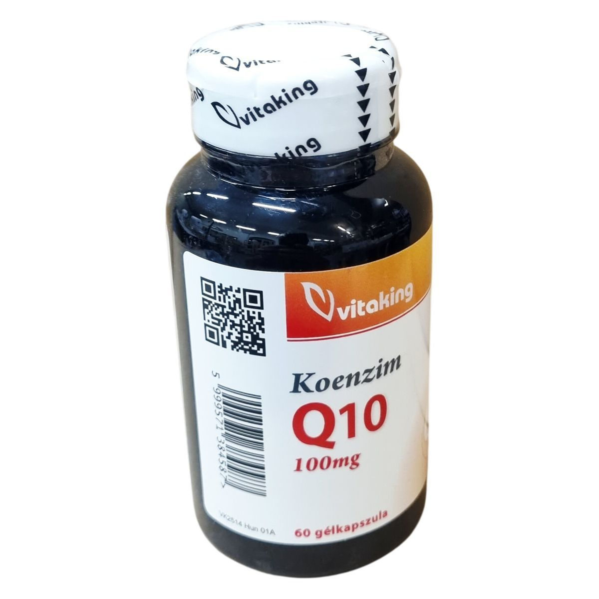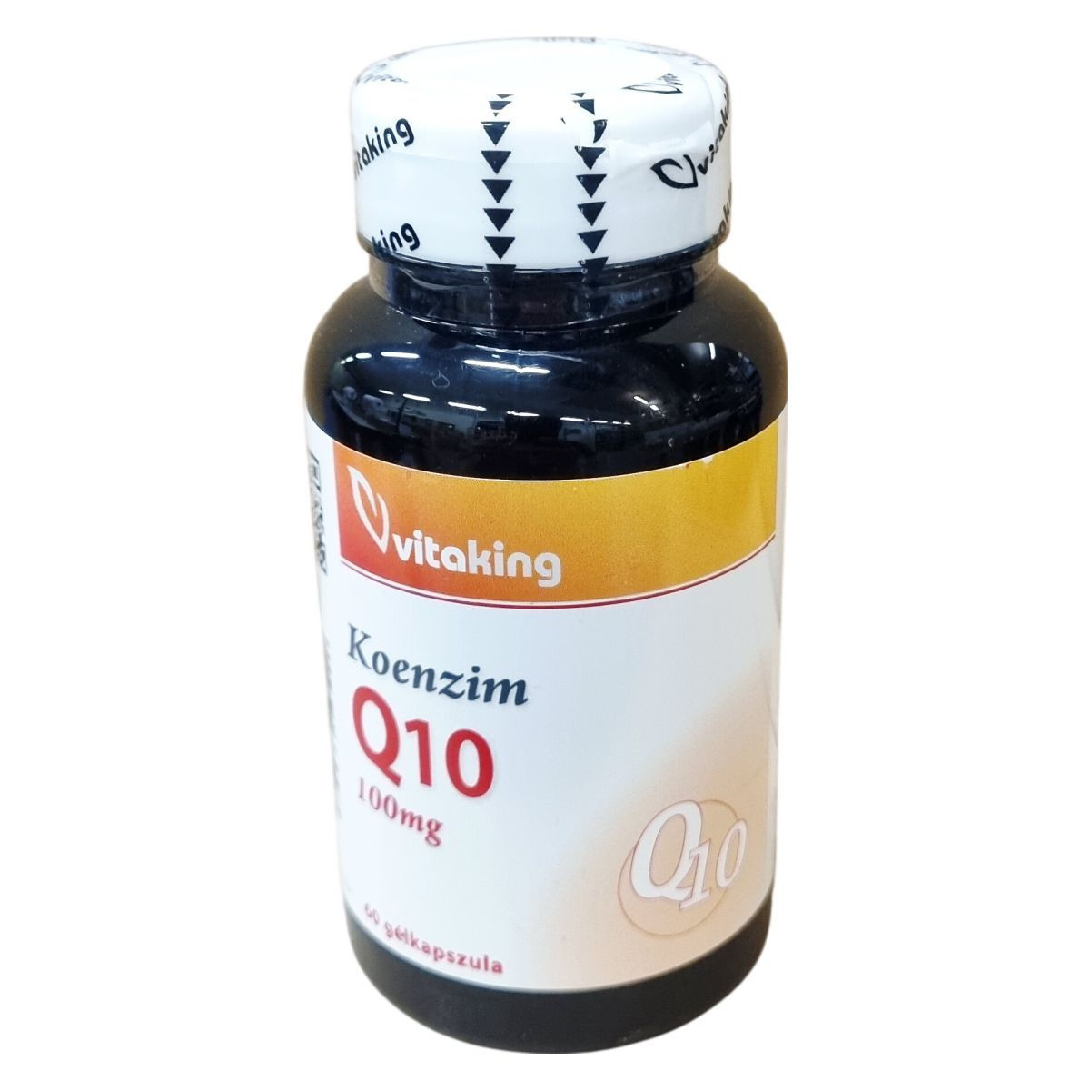 A Vitaking Koenzim Q10 100 mg étrend-kiegészítő 60 gélkapszulát tartalmaz, amelyben a hatóanyagként szereplő koenzim Q10 100 mg mennyiségben található meg kapszulánként. A termék összetevői között napraforgó olaj, zselatin kapszulahéj, koenzim Q10, nedvesítőszerek (glicerin, tisztított víz), stabilizátor (zsírsavak mono- és digliceridjei), emulgeálószer (szója lecitin) és színezék (barna vas-oxid) vannak jelen. A napi ajánlott fogyasztás 1 kapszula étkezés közben, melyet nem szabad túllépni. A termék nem pótolja a vegyes étrendet és az egészséges életmódot. A készítmény minőségét a doboz oldalán feltüntetett időpontig őrzi meg. Tárolása gyermekektől elzárva, száraz és hűvös helyen, közvetlen fénytől és sugárzó hőtől védve javasolt.