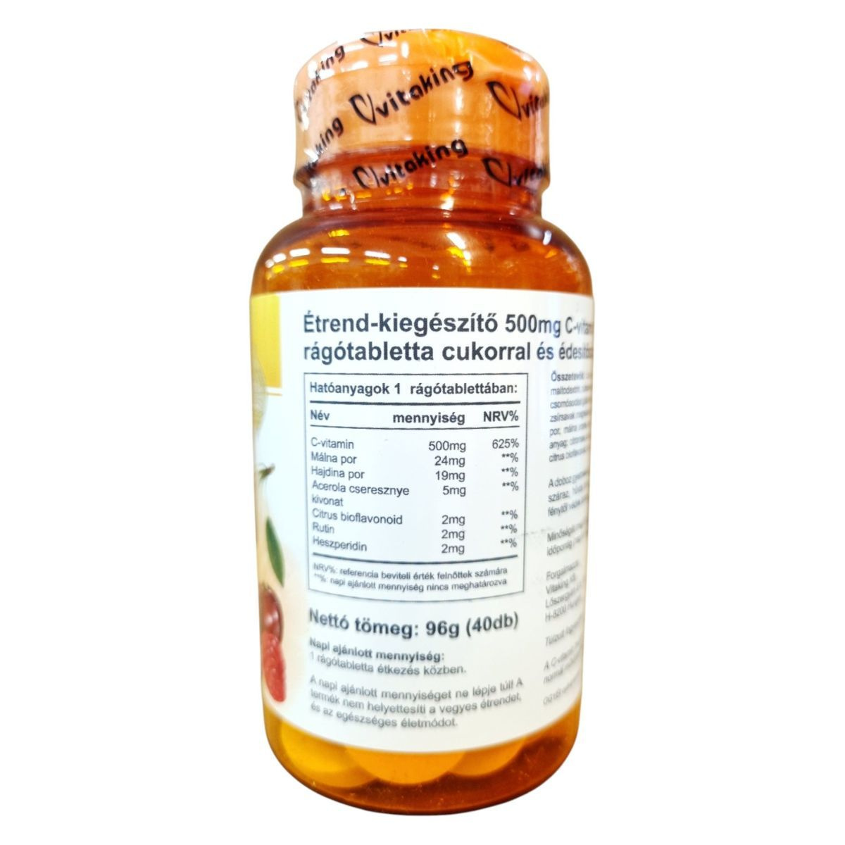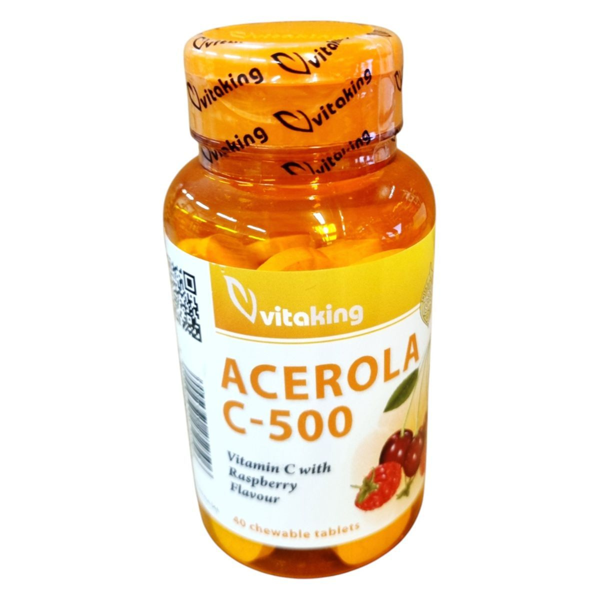 A Vitaking ACEROLA C-500 rágótabletta 500 mg C-vitamint tartalmaz, amely hozzájárulhat az immunrendszer normál működéséhez. A termék málna ízesítéssel készült, és további összetevői között megtalálható a málna por, hajdina por, acerola cseresznye kivonat, citrus bioflavonoid, rutin és heszperidin. A termék cukorral és édesítőszerrel készült, és figyelmeztetést tartalmaz a túlzott fogyasztás hashajtó hatásáról. A termék tárolása száraz, hűvös helyen javasolt, gyermekek elől elzárva.