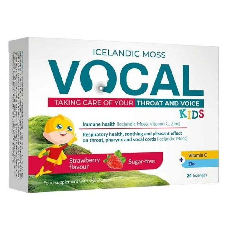 Izlandi zuzmó (Cetraria islandica) enyhíti a torok és a garat irritációját. Nyugtató és kellemes hatással van a torokra, garatra és a hangszálakra. Védi a száj és a torok nyálkahártyáját. A Vocal izlandi zuzmót, C-vitamin és cink elegyet tartalmaz. A C-vitamin és a cink hozzájárul az immunrendszer megfelelő működéséhez és védi a sejteket az oxidatív stressztől. A cink szerepet játszik a sejtosztódás folyamatában.Ajánlott felhasználás 1 szopogató tabletta naponta négyszer, szájban lassan feloldva. 4 éves kor feletti személyek részére.