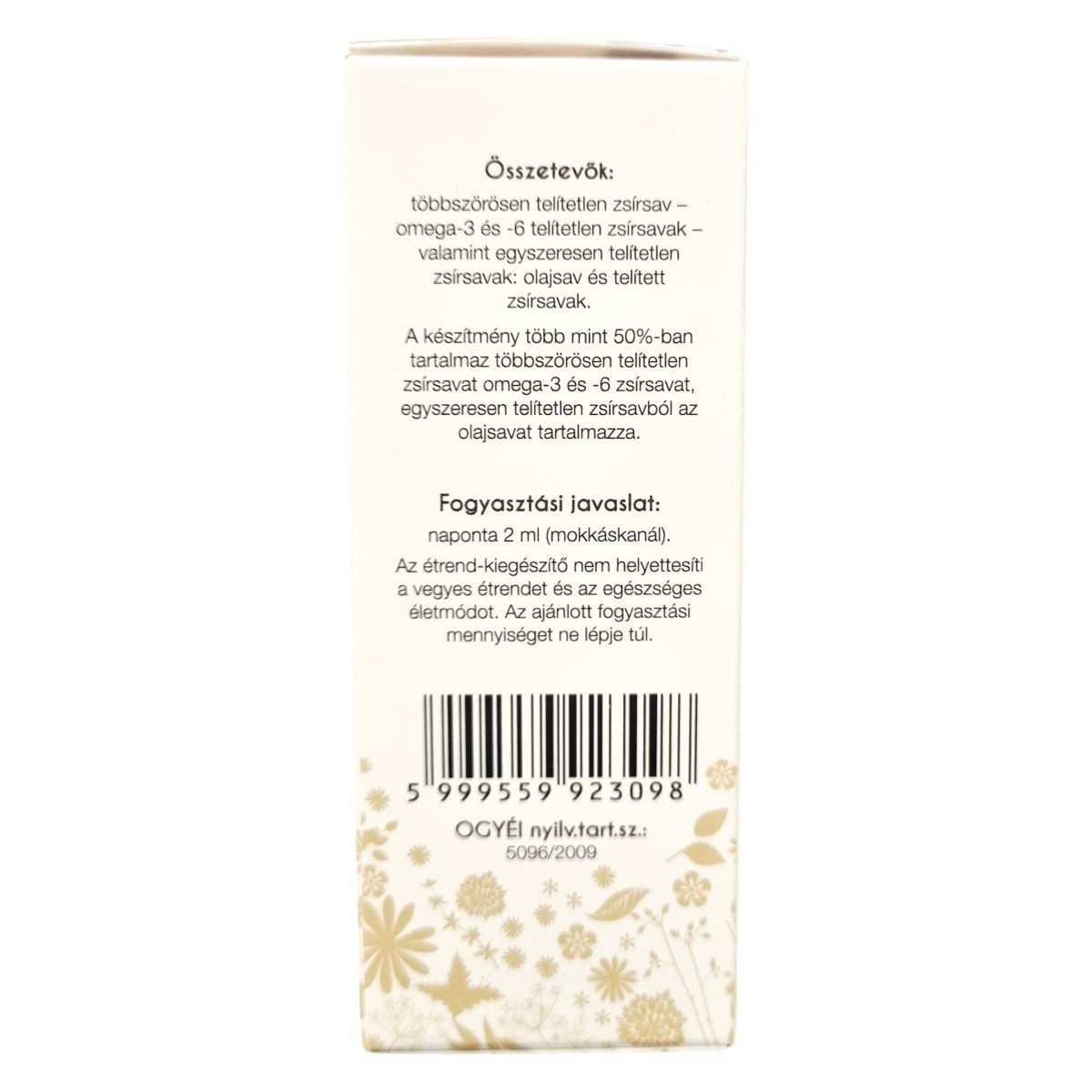 A termék 100%-os hidegen sajtolt lenmagolaj, amely Magyarországon készül. A készítmény több mint 50%-ban tartalmaz többszörösen telítetlen zsírsavakat, különösen omega-3 és omega-6 zsírsavakat, valamint egyszeresen telítetlen zsírsavakat, főként olajsavat. A lenmagolaj 50 ml-es kiszerelésben érhető el. A termék csomagolásán szerepel a vonalkód és az OGYÉI engedélyszám is. Ez az étrend-kiegészítő természetes zsírsavforrásként szolgálhat, mely hozzájárulhat az egészséges étrend kiegészítéséhez.