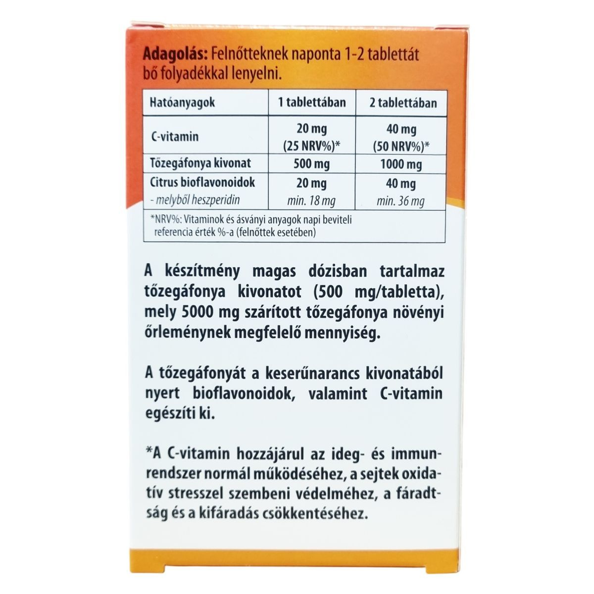 C-vitamin 20 mg (25 NRV%) 1 tablettában, 40 mg (50 NRV%) 2 tablettában