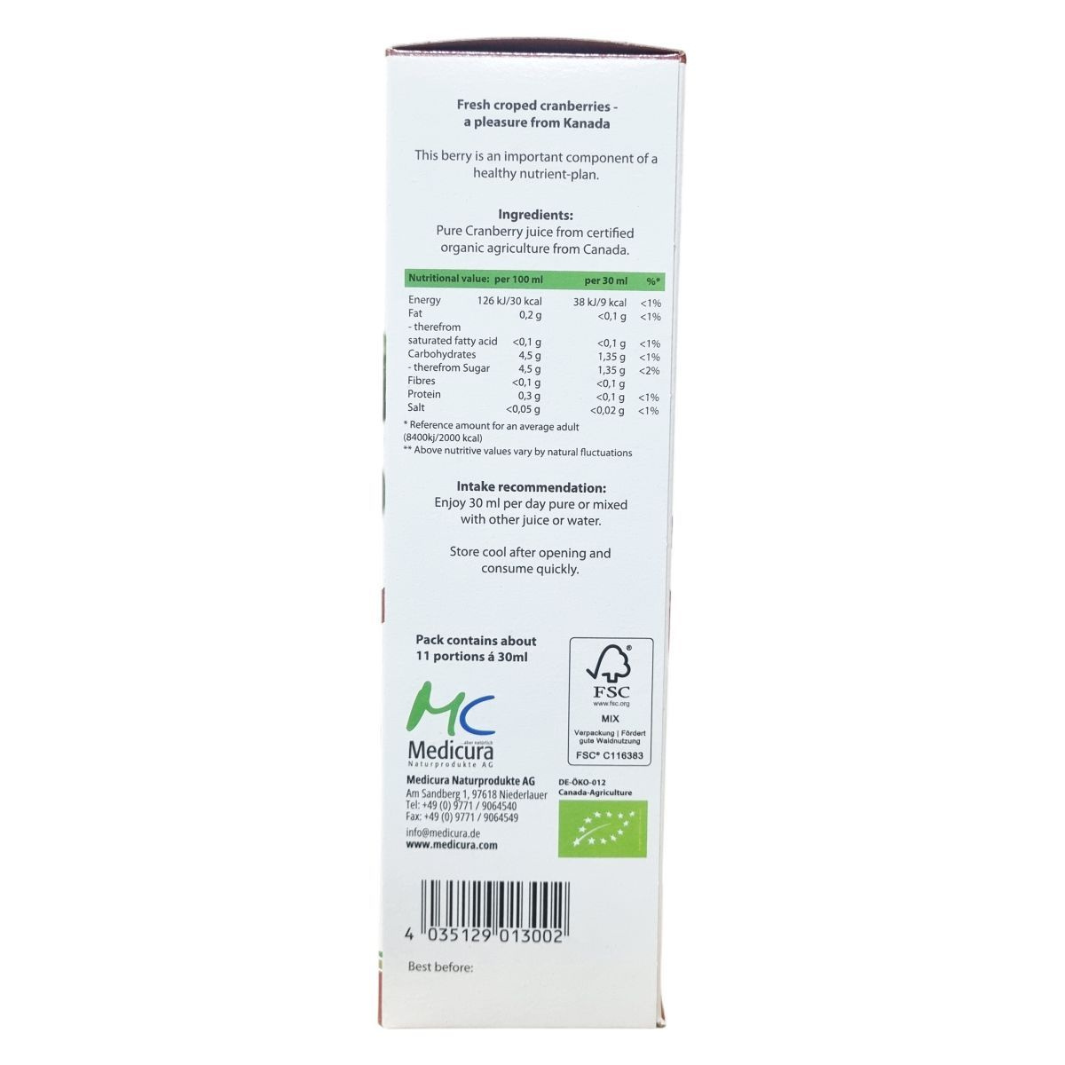 A medicura® Cranberry tiszta, préselt tőzegáfonya levet tartalmaz, amely ellenőrzött biogazdálkodásból származik és Kanadából származó friss termésből készül. A tőzegáfonya fontos része egy egészséges étrendnek, a termék vegán és bio minősítésű. A csomagolás FSC tanúsítvánnyal rendelkezik, támogatva a fenntartható erdőgazdálkodást. A palack tartalma körülbelül 11 adag 30 ml-enként.