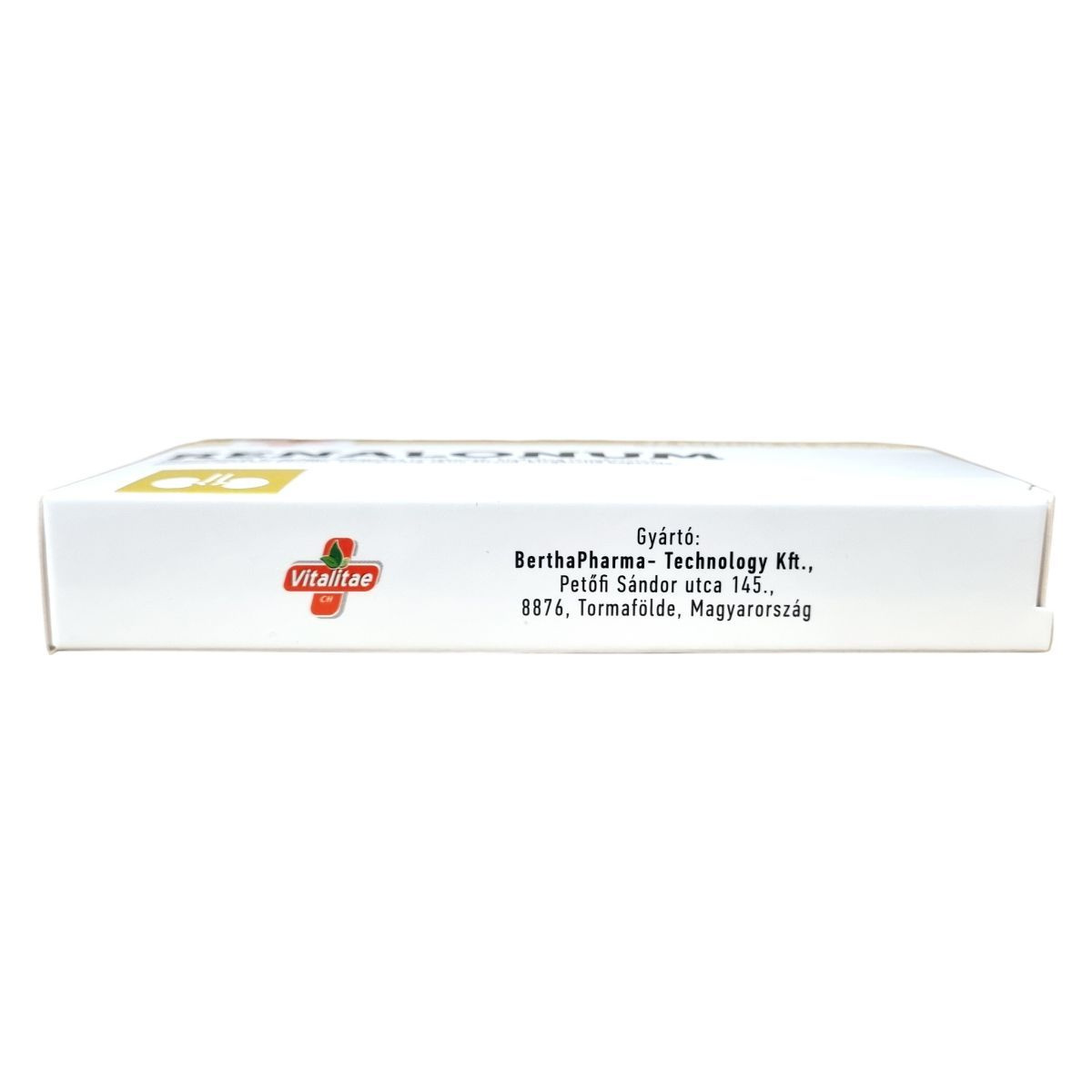 A Vitalitae CH RENALONUM kapszula egy biológiailag aktív étrend-kiegészítő, amely kizárólag természetes alapanyagokból készül. Fő összetevői között vörösáfonya kivonat, valamint többféle gyógynövény és természetes vegyület található, mint az alga eredetű kalcium, jávatea, nyírfalevél, bodzavirág és aranyvessző kivonatok, továbbá prolin és L-glutaminsav. Ezek az alkotók egymással összhangban segíthetik a szervezet egészséges működését. A kapszula formában történő alkalmazás lehetővé teszi az egyszerű és kényelmes használatot. A készítmény gyártója a BerthaPharma-Technology Kft., amely Magyarországon, Tormaföldén található. A termék minőségét a csomagoláson feltüntetett időpontig megőrzi.