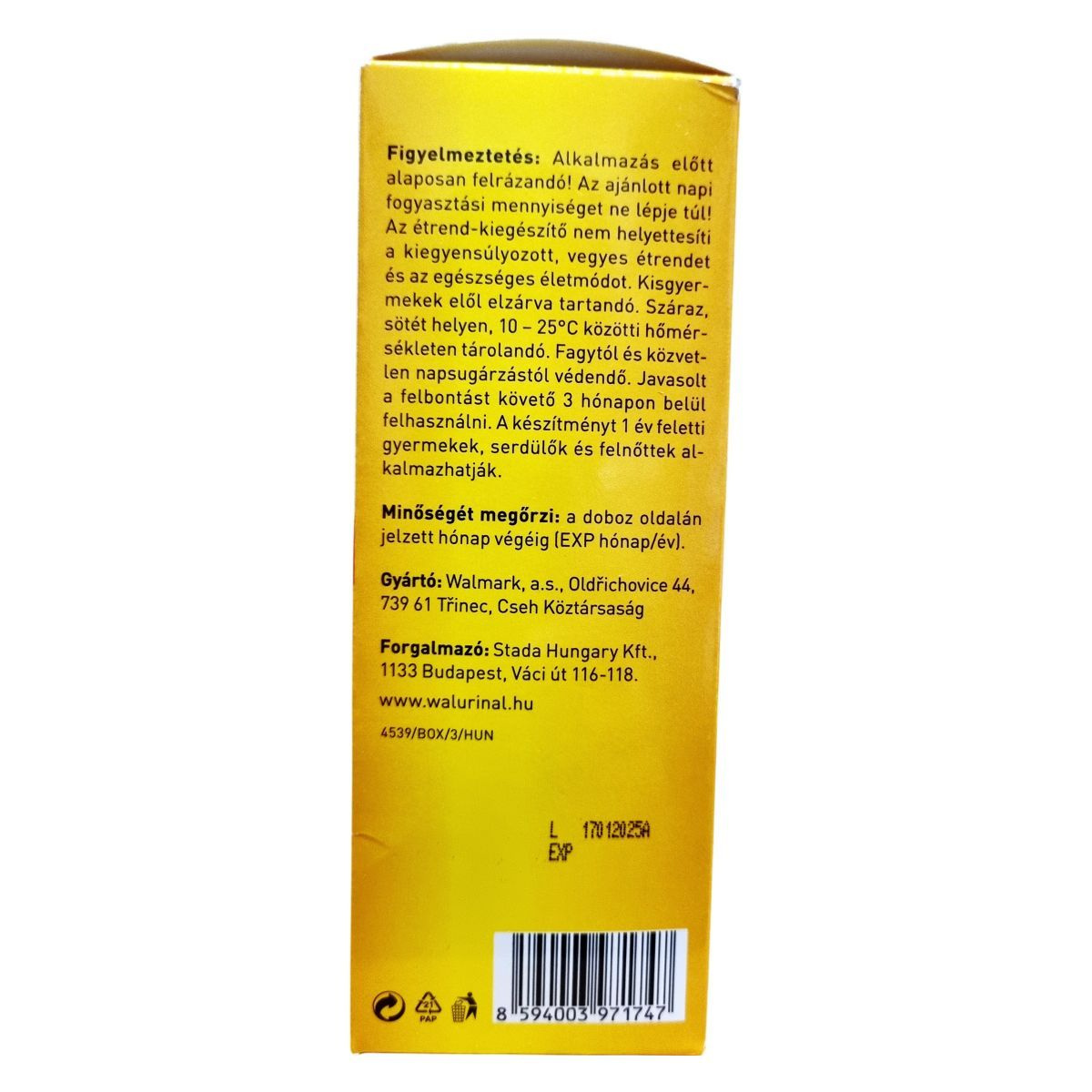 A Walurinal® szirup egy étrend-kiegészítő, amely amerikai tőzegáfonya kivonatot tartalmaz. A termék fő hatóanyaga a Vaccinium macrocarpon gyümölcslé por, amely proantocianidint (PAC) tartalmaz. A szirup már 1 éves kortól alkalmazható, és antibiotikumokkal együtt is szedhető. A termék 150 ml-es kiszerelésben kapható, és a napi adagolás a korosztálytól függően változik. A szirup invert szirupot, tisztított vizet és citromsavat is tartalmaz. Fontos, hogy a terméket száraz, sötét helyen, 10 – 25°C közötti hőmérsékleten tároljuk, és a felbontást követő 3 hónapon belül használjuk fel. A gyártó Walmark, a.s., a forgalmazó pedig a Stada Hungary Kft.