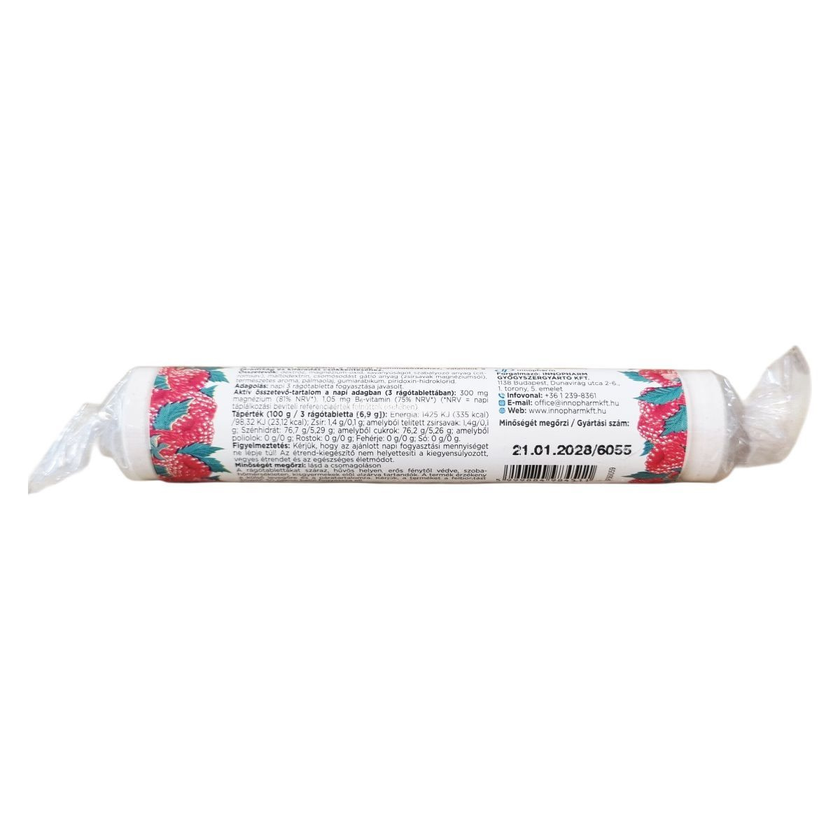 Az 1x1 Vitamin Magnézium 100 mg + B6 málnaízű rágótabletta szőlőcukorral magnéziumot és B6-vitamint tartalmaz, amely hozzájárulhat a normál izomműködéshez és segítheti a fáradtság csökkentését. A termék szőlőcukrot is tartalmaz, és a napi ajánlott adag három rágótabletta, mely 300 mg magnéziumot és 1,05 mg B6-vitamint biztosít. A termék összetevői között szerepel dextróz, magnézium-oxid, citromsav, maltodextrin, csomósodást gátló anyag, természetes aroma, pálmaolaj, gumiarábikum és piridoxin-hidroklorid. Energia- és tápértéke 100 grammra és a napi adagra lebontva részletesen dokumentált. A termék származási helye az Európai Unió. Az étrend-kiegészítő nem helyettesíti a kiegyensúlyozott étrendet és az egészséges életmódot. A tabletták érzékenyek a levegőre és a páratartalomra, ezért száraz, hűvös helyen kell tárolni őket, elzárva a gyermekektől.