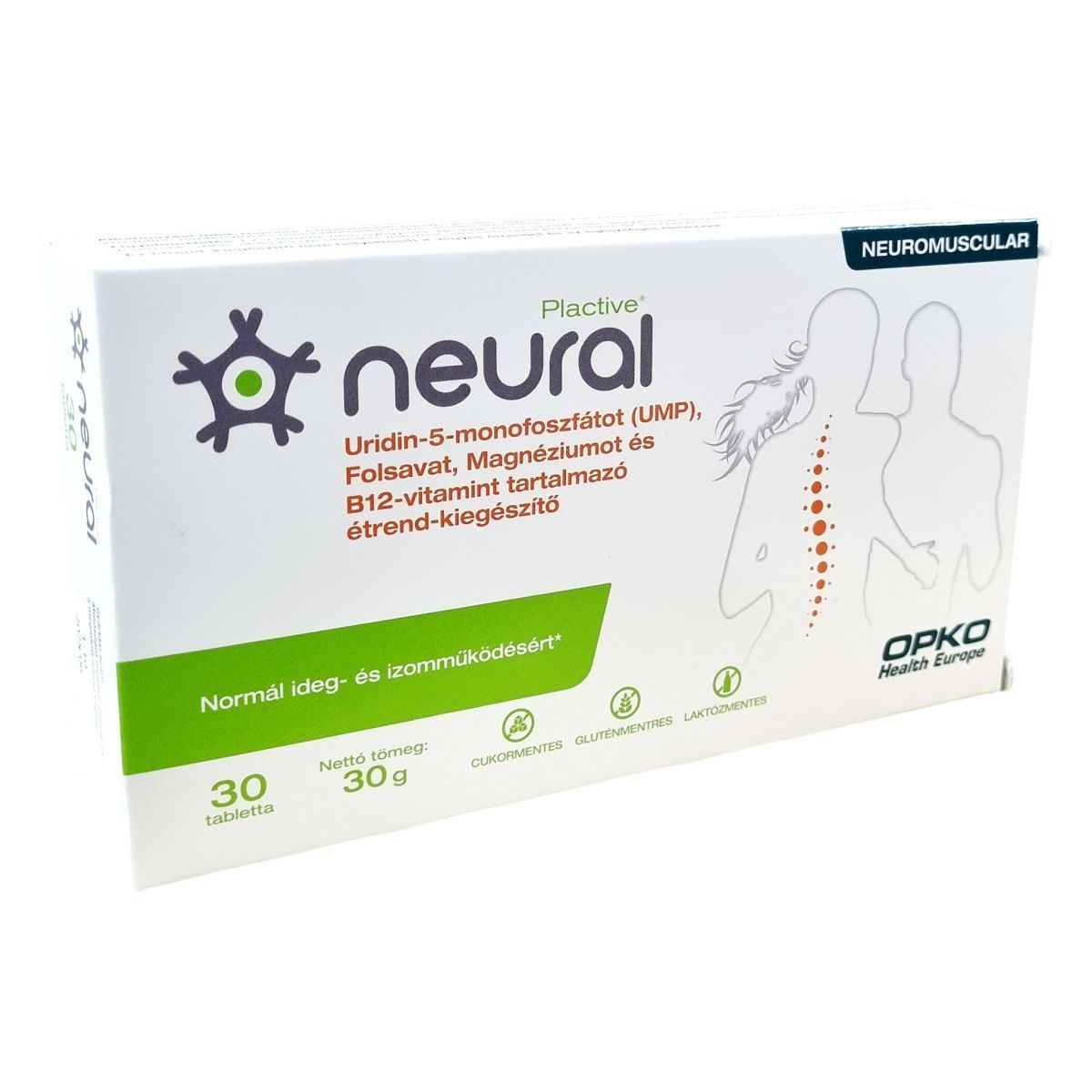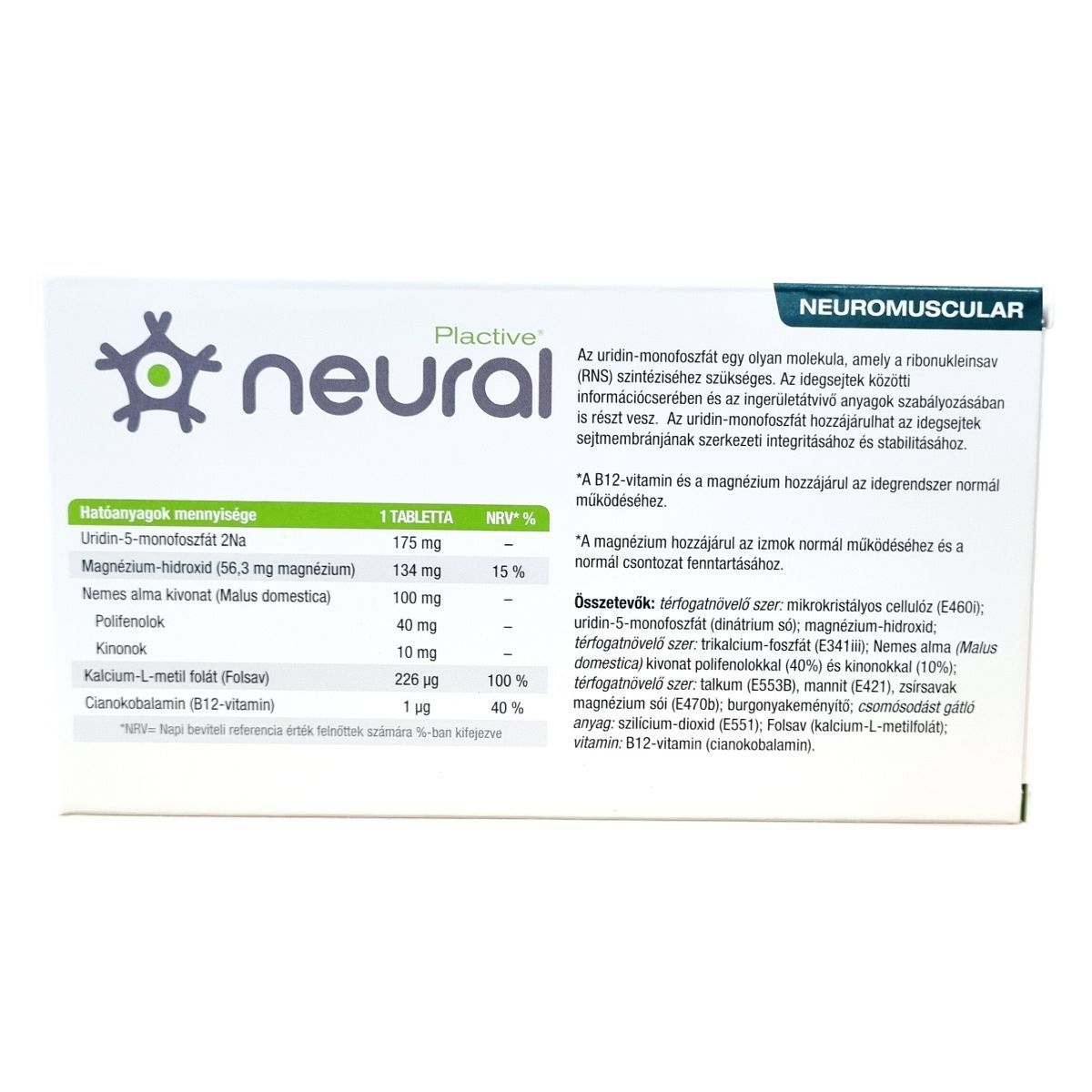 A Plactive neural egy komplex étrend-kiegészítő, amely uridin-5-monofoszfátot, folsavat, magnéziumot és B12-vitamint tartalmaz, hozzájárulva az ideg- és izomműködés támogatásához.