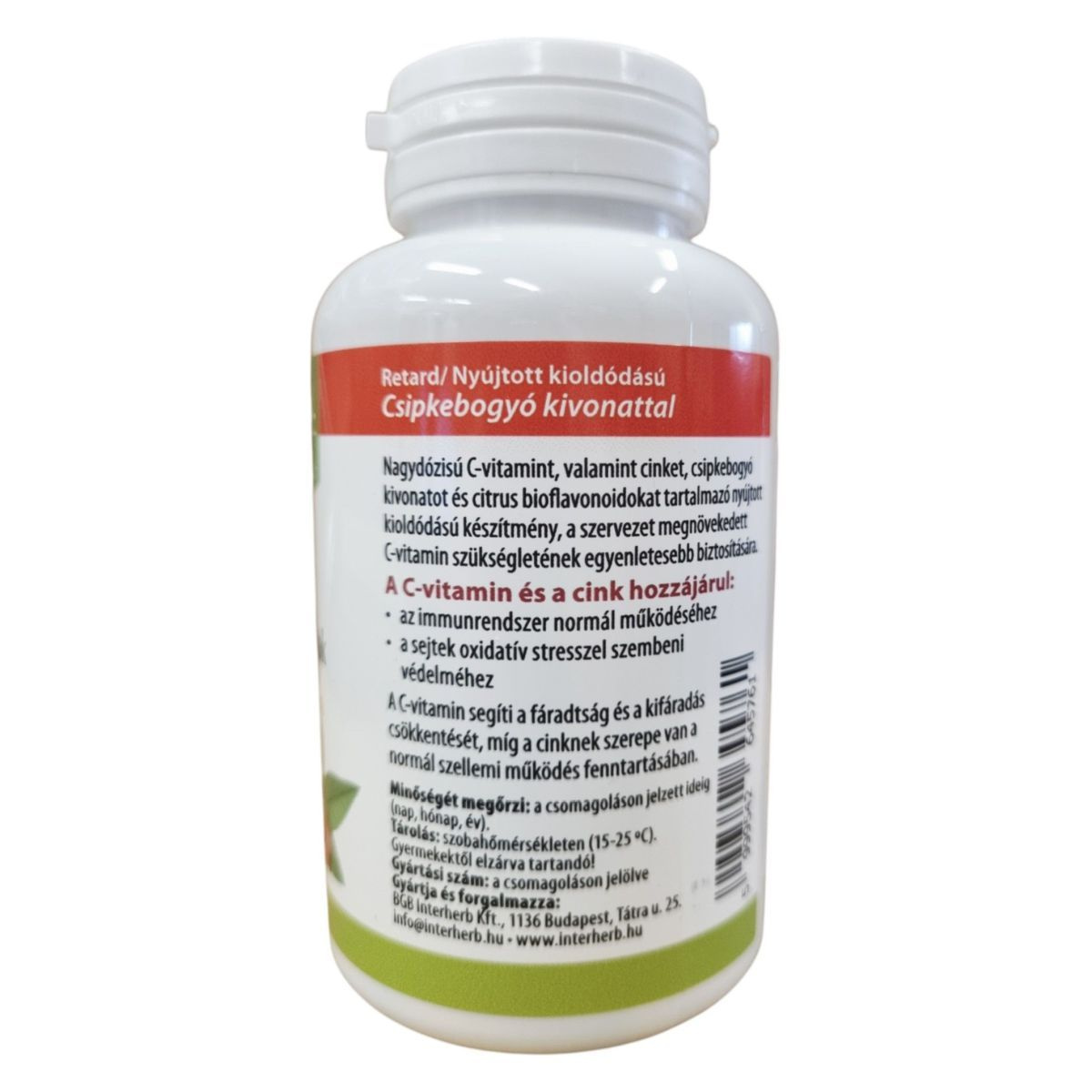 Az INTERHERB XXL étrend-kiegészítő tabletta nagydózisú C-vitamint, cinket, csipkebogyó kivonatot és citrus bioflavonoidokat tartalmaz, amelyek hozzájárulhatnak az immunrendszer normál működéséhez és a sejtek oxidatív stresszel szembeni védelméhez. A termék nyújtott kioldódású, így a szervezet megnövekedett C-vitamin szükségletének egyenletesebb biztosítására szolgálhat. A C-vitamin segíthet a fáradtság és a kifáradás csökkentésében, míg a cink szerepet játszhat a normál szellemi működés fenntartásában. A termék csomagolása 90 db tablettát tartalmaz, és a javasolt napi adag 1 tabletta, amelyet étkezést követően, bő vízzel kell bevenni.