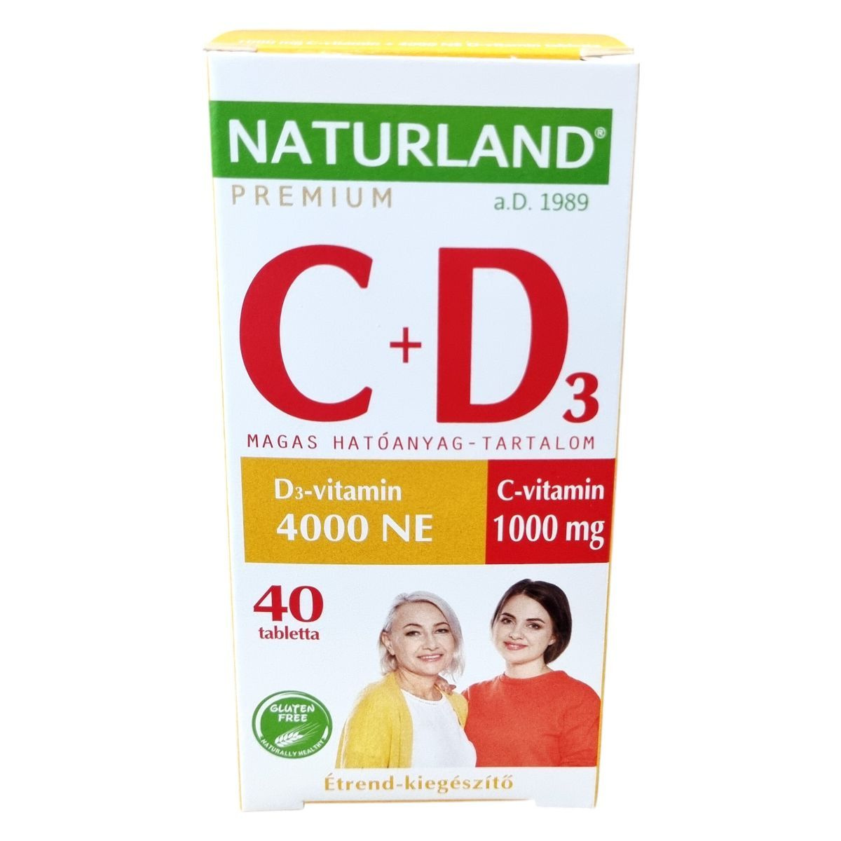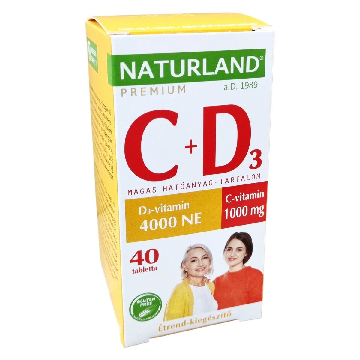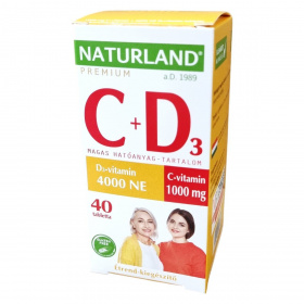 A NATURLAND® C + D3 vitamintabletta egy Magyarországon előállított étrend-kiegészítő, amely C- és D-vitamin magas dózisát kínálja egyben. A C-vitamin hozzájárulhat az immunrendszer és az idegrendszer normál működéséhez, a kollagénképződéshez, valamint a sejtek oxidatív stresszel szembeni védelméhez, továbbá a fáradtság csökkentéséhez. A D-vitamin támogatja az immunrendszer működését, az egészséges fogazat, csontozat és izomfunkció fenntartását. A termék gluténmentes és mentes más allergénektől, természetes egészséges összetevőket tartalmaz. A csomagolás 40 tablettát tartalmaz, a nettó tömeg 52,0 g. A termék megvásárlásával magyar munkahelyeket is támogathatunk. Mindig tartsa be az ajánlott adagolást, és konzultáljon orvosával, ha vesekő-betegsége van vagy bizonytalan a készítmény alkalmazását illetően.
