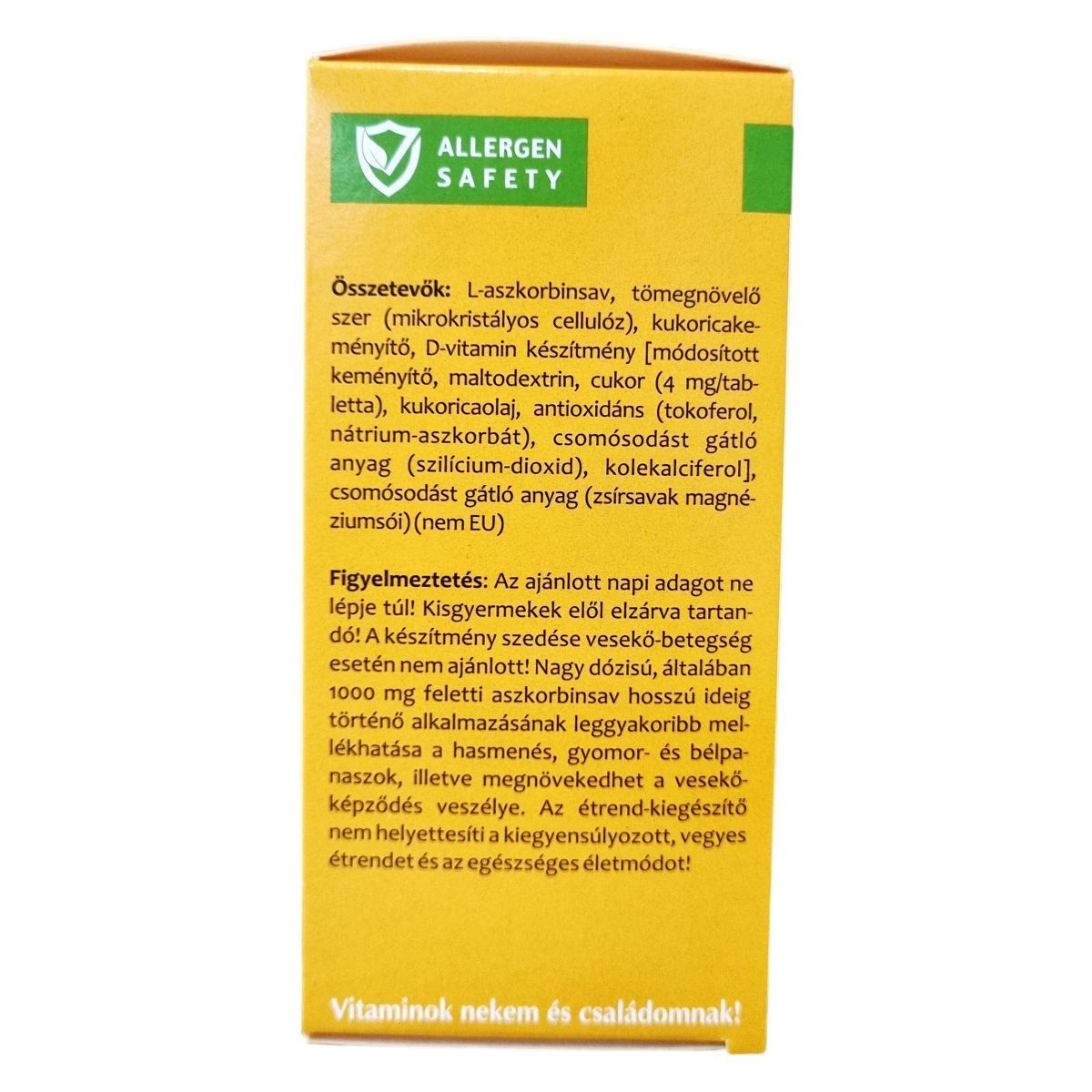 Az ajánlott napi adagot ne lépje túl! Kisgyermekek elől elzárva tartandó! A készítmény szedése vesekő-betegség esetén nem ajánlott! Nagy dózisú, általában 1000 mg feletti aszkorbinsav hosszú ideig történő alkalmazásának leggyakoribb mellékhatása a hasmenés, gyomor- és bélpanaszok, illetve megnövekedhet a vesekőképződés veszélye. Az étrend-kiegészítő nem helyettesíti a kiegyensúlyozott, vegyes étrendet és az egészséges életmódot!