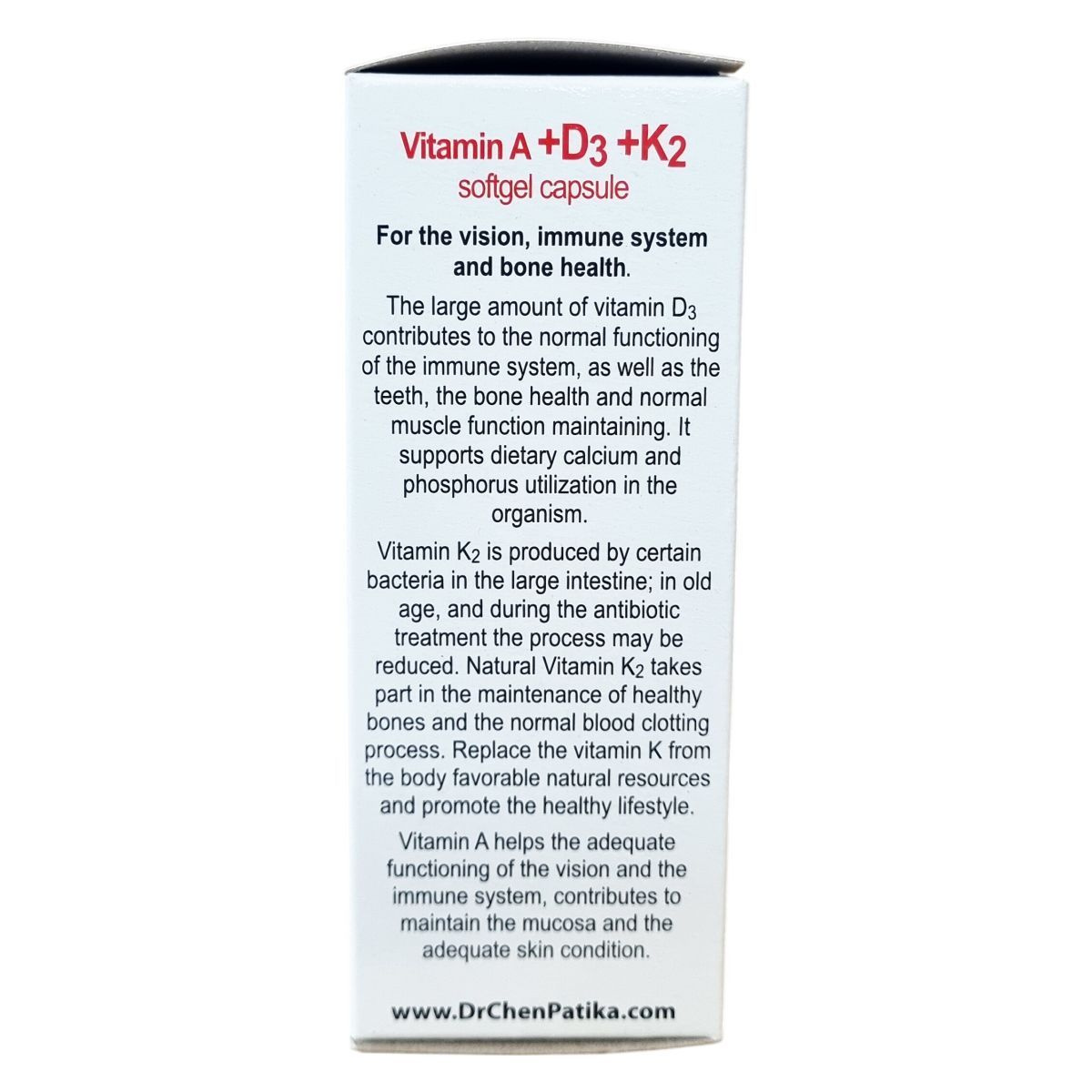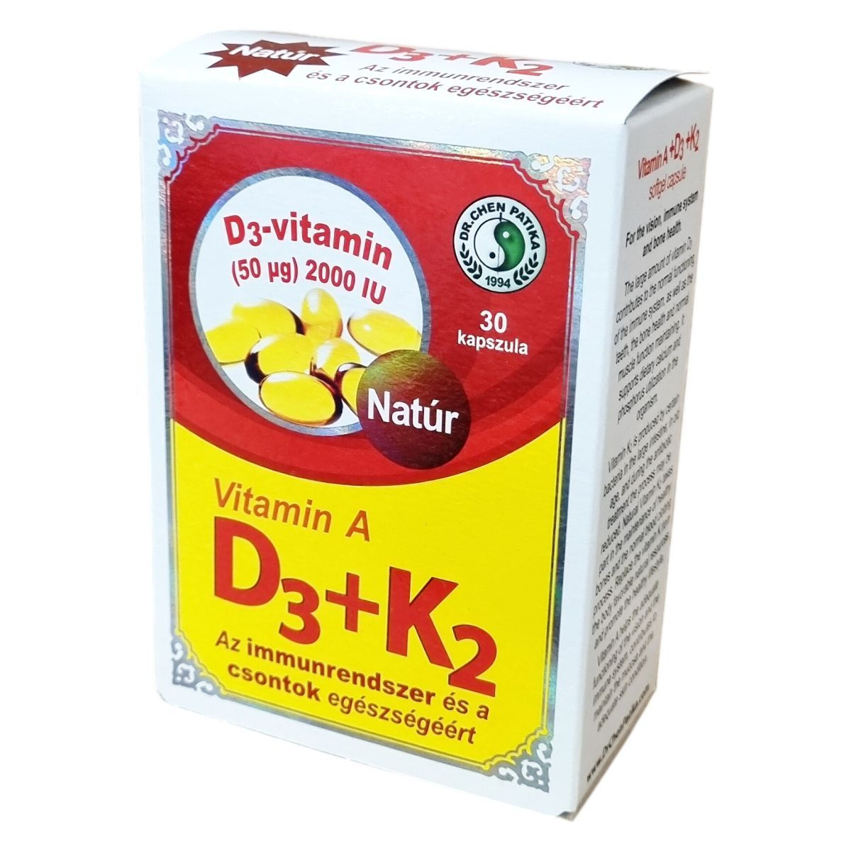 A nagy mennyiségű D3-vitamin az immunrendszer megfelelő működéséhez, valamint a fogazat, a csontrendszer egészségéhez és a normál izomfunkciók fenntartásához járul hozzá. Támogatja a táplálékkal bevitt kalcium és a foszfor hasznosulását a szervezetben. A K2-vitamin termelése a vastagbélben lévő egyes baktériumok által történik; időskorban, illetve antibiotikus kezelés hatására a folyamat csökkenhet. A természetes K2-vitamin részt vesz az egészséges csontrendszer fenntartásában, valamint a normál véralvadási folyamatban. Pótolja a K-vitamint a szervezet számára kedvező természetes forrásból, és támogassa az egészséges életmódot. Az A-vitamin segíti a látás és az immunrendszer normál működését, hozzájárul a nyálkahártya és a bőr megfelelő állapotának fenntartásához.