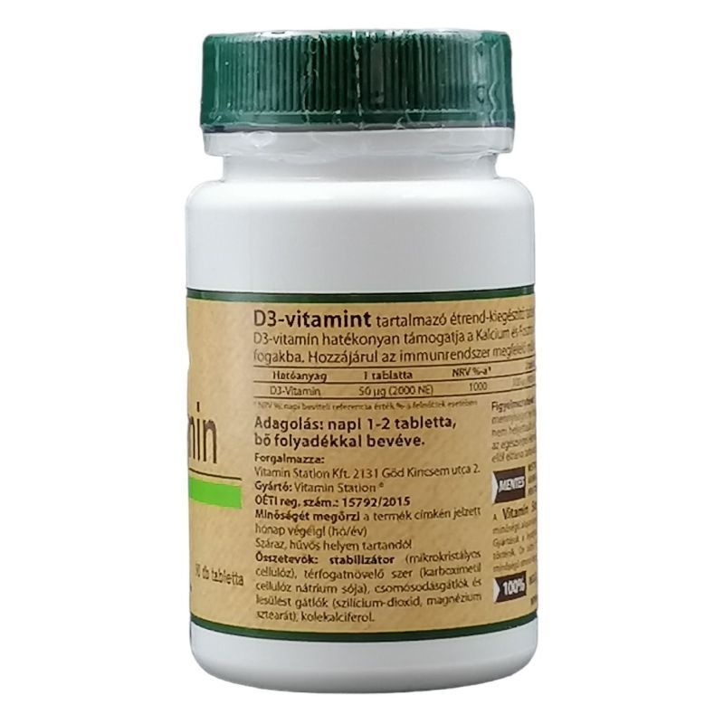 Hozzájárul a kalcium és a foszfor normál felszívódásához-hasznosulásához, a vér normál kalciumszintjének fenntartásához, az egészséges csontozat, fogazat és izomfunkció fenntartásához, a normál sejtosztódáshoz. A Vitamin Station D3-vitamin étrend-kiegészítője 2000 NE kolekalciferolt tartalmaz, mely segíthet megőrizni csontjaink, fogaink, izmaink egészségét, valamint hozzájárulhat immunrendszerünk épségének megőrzéséhez is.