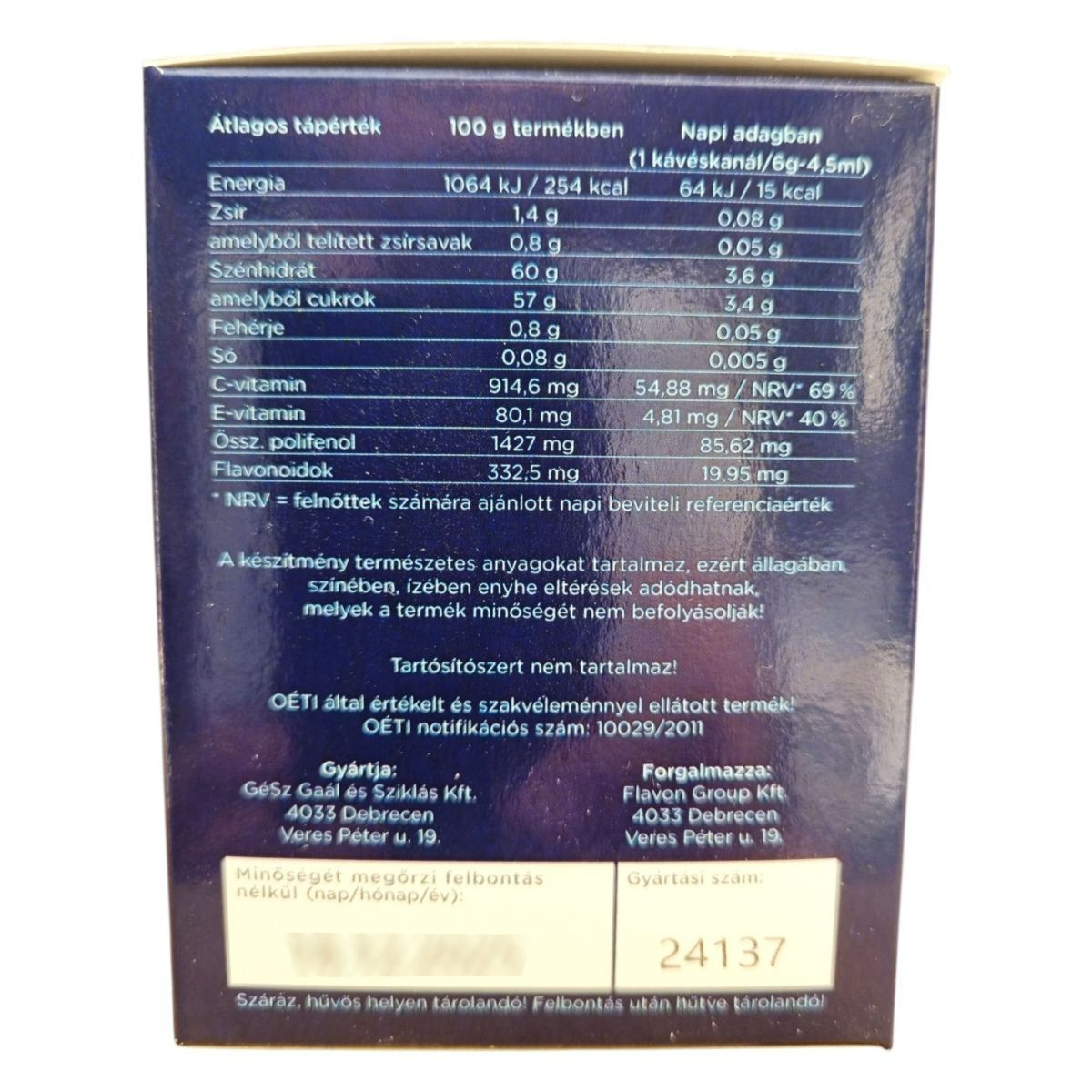 A Flavon Max egy polifenolokat tartalmazó étrend-kiegészítő, amely különféle gyümölcsök és növények koncentrátumait tartalmazza, mint például fekete ribizli, áfonya, bodzabogyó és homoktövis. A termék C- és E-vitamin tartalma hozzájárulhat a sejtek védelméhez az oxidatív stresszel szemben. A Panax ginseng adaptogén hatása miatt a termék fogyasztásában szünetet kell tartani, és bizonyos egészségügyi állapotok esetén nem javasolt a fogyasztása. A termék tartósítószert nem tartalmaz, és természetes összetevői miatt enyhe eltérések lehetnek az állagában, színében és ízében, amelyek a minőséget nem befolyásolják.