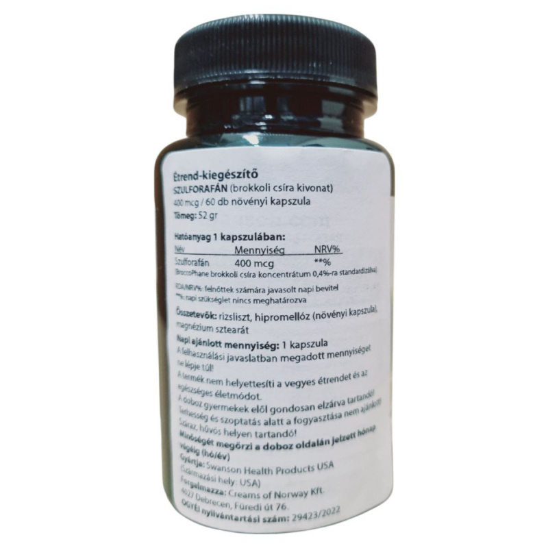 A Swanson Szulforafán étrend-kiegészítő brokkoli csíra kivonatot tartalmaz, amely szulforafánban gazdag. A termék napi adagja egy kapszula, amely 400 mcg szulforafánt biztosít. A kapszulák növényi alapúak, így vegetáriánusok számára is alkalmasak lehetnek. A termék tartalmaz szulfitokat, ezért allergiások számára nem ajánlott. A termék használata nem javasolt terhesség és szoptatás alatt. A termék minőségét a doboz oldalán jelzett hónap végéig őrzi meg. Forgalmazza a Creams of Norway Kft., Debrecen.