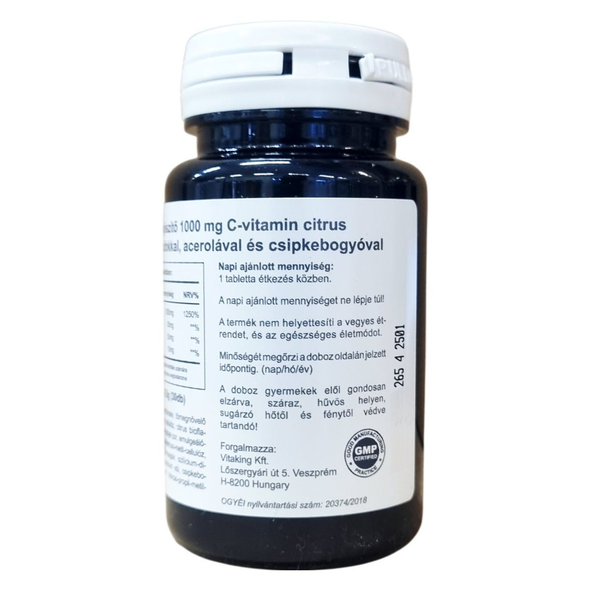 Az étrend-kiegészítő egy tablettánként 1000 mg C-vitamint tartalmaz bioflavonoidokkal, acerolával és csipkebogyóval. Az összetevők között megtalálható az aszkorbinsav, tömegnövelő szerként mikrokristályos cellulóz, valamint emulgeálószerként térhálós nátrium-karboxi-metil-cellulóz. A csomósodást gátló anyagok a szilícium-dioxid és a zsírsavak magnézium sói, stabilizátorként pedig hidroxi-propil-metil-cellulóz szolgál. A termék nettó tömege 43,5 g és 30 tablettát tartalmaz. A Vitaking Kft. forgalmazza a terméket, melynek OGYÉI engedély száma 20374/2018. A doboz oldalsó részén feltüntetett időpontig megőrzi minőségét.