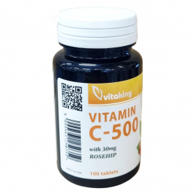 A Vitaking Vitamin C-500 étrend-kiegészítő tablettánként 500 mg C-vitamint és 30 mg csipkebogyót tartalmaz. A C-vitamin hozzájárulhat az immunrendszer normál működéséhez. A készítmény összetevői között aszkorbinsav, mikrokristályos cellulóz, hidroxi-propil-metil-cellulóz, zsírsavak, szilícium-dioxid, zsírsavak magnézium sói és csipkebogyó találhatók. A termék nem helyettesíti a vegyes étrendet és az egészséges életmódot. Ajánlott az 1 tabletta fogyasztása étkezés közben, és fontos, hogy a napi ajánlott mennyiséget ne lépjük túl. Az étrend-kiegészítőt gyermekektől elzárva, száraz, hűvös helyen, sugárzó hőtől és fénytől védve kell tárolni. A minőségmegőrzési időpont a doboz oldalán található.