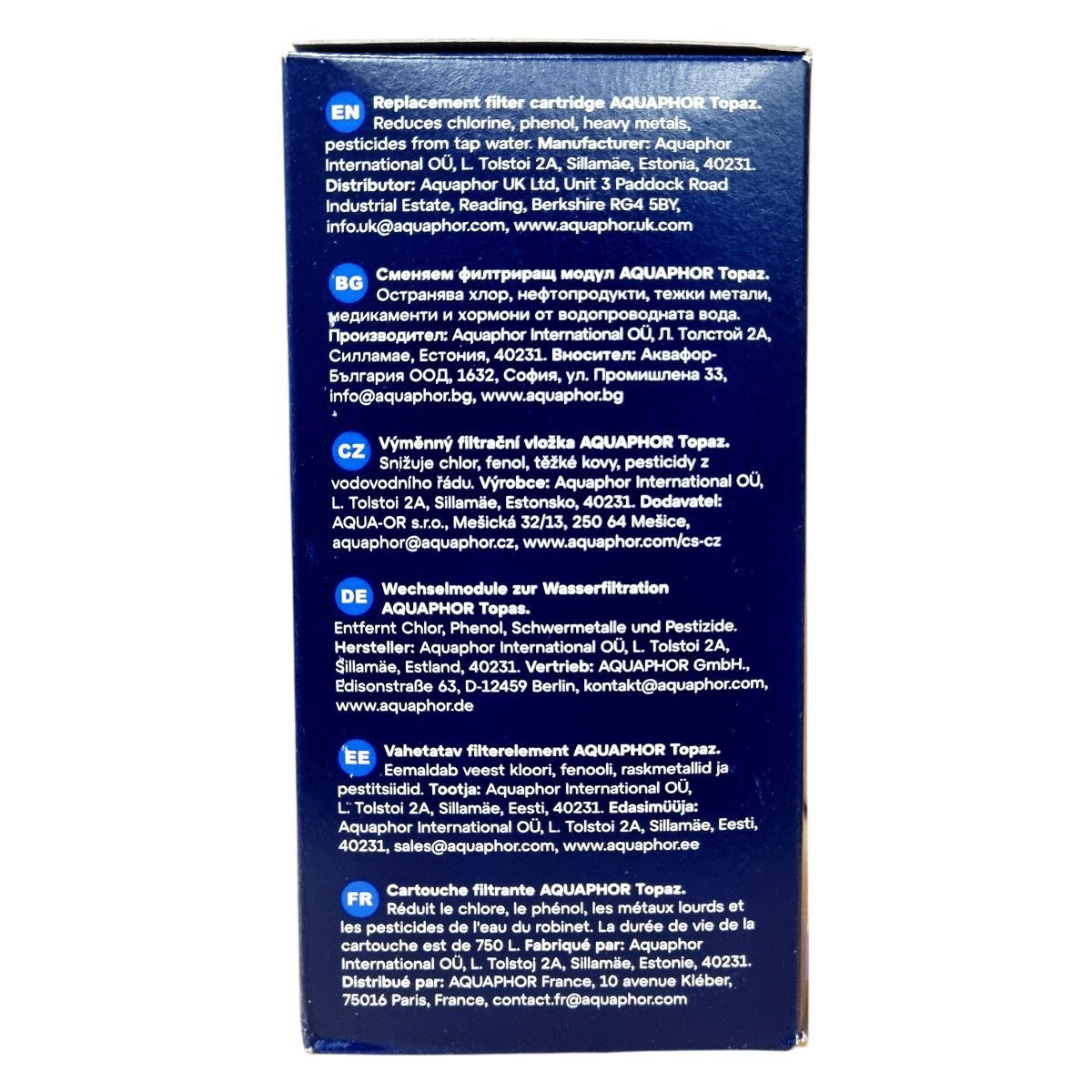 Az AQUAPHOR TOPAZ vízszűrő cserepatron 750 liter kapacitással rendelkezik, BPA-mentes anyagokból készült. A termék segít csökkenteni a csapvízben előforduló káros szennyeződések, például klór, peszticidek, fenolok és nehézfémek mennyiségét, ezáltal biztonságosabb és tisztább ivóvizet biztosít. A szűrőben található AQUALEN™ szűrőanyag hatékonyan működik a víz tisztításában. A patron több országban forgalmazott és mindenhol az Aquaphor nemzetközi leányvállalatai forgalmazzák, melyek a helyi szabályozásoknak megfelelően biztosítják a termék kiszolgálását. A termék használata során javasolt a helyi környezetvédelmi előírások betartása a hulladék ártalmatlanításakor.