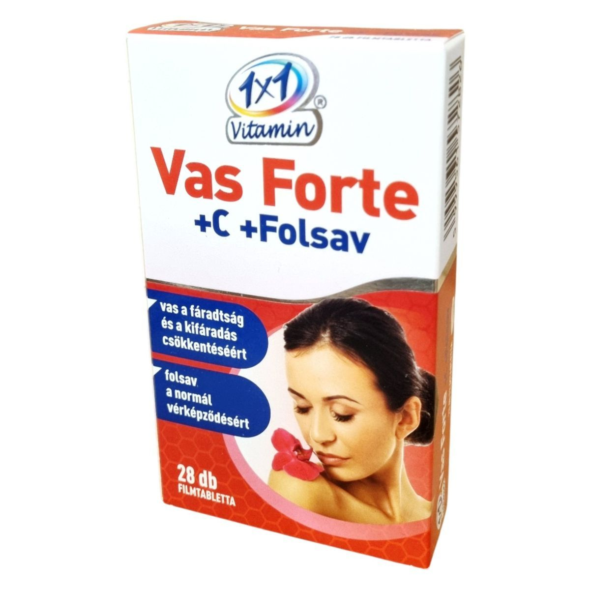 Az 1x1 Vitamin Vas Forte +C +Folsav étrend-kiegészítő filmtabletta vasat, C-vitamint, folsavat és B12-vitamint tartalmaz. Ezek a hatóanyagok együttesen támogathatják a szervezet energiaháztartását és a vérképzést. A vas hozzájárulhat a fáradtság csökkentéséhez, míg a folsav és a B12-vitamin segíthetik a normál vérképződést. A termék napi egy tablettás adagolással könnyen fogyasztható, és ideális választás lehet a fokozott vas- és vitaminigény pótlására. A csomag 28 darab filmtablettát tartalmaz, nettó tömege 14 g. A terméket az Innopharm Gyógyszergyártó Kft. forgalmazza, székhelye Budapest. A filmtabletták szorbitot tartalmaznak, ezért túlzott fogyasztásuk hashajtó hatású lehet.