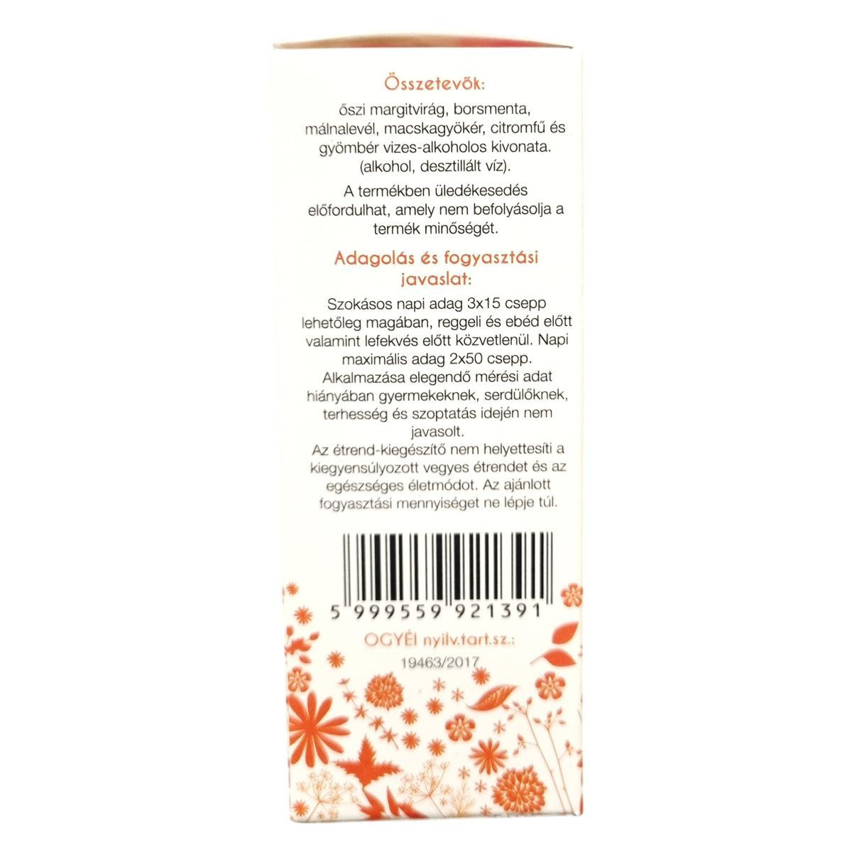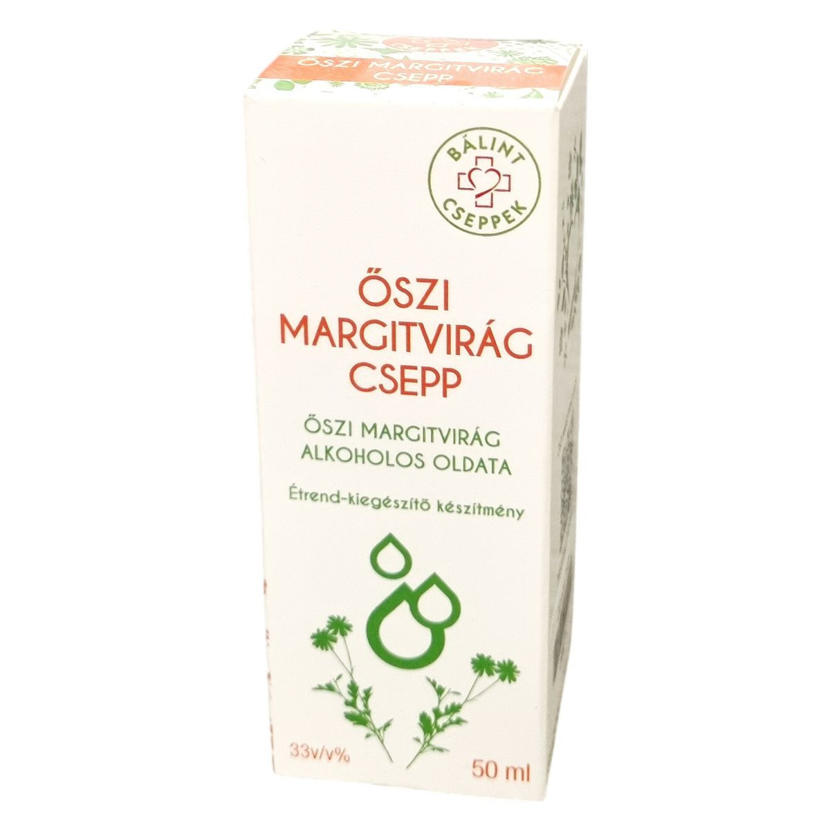 Az őszimargitvirág csepp 33v/v% alkoholtartalmú vizes-alkoholos oldat, amelyet több gyógynövény, köztük őszi margitvirág, borsmenta, málnalevél, macskagyökér, citromfű és gyömbér kivonatának kombinálásával készítenek. A termék tartalmaz alkoholt és desztillált vizet. A készítményben előfordulhat üledékesedés, amely a minőséget nem befolyásolja. A termék fogyasztása javasolt reggeli, ebéd és lefekvés előtt. A termék alkalmazása gyermekek, serdülők, terhes és szoptató nők esetében nem ajánlott a hiányzó mérési adatok miatt. A készítmény nem helyettesíti a kiegyensúlyozott étrendet és az egészséges életmódot.