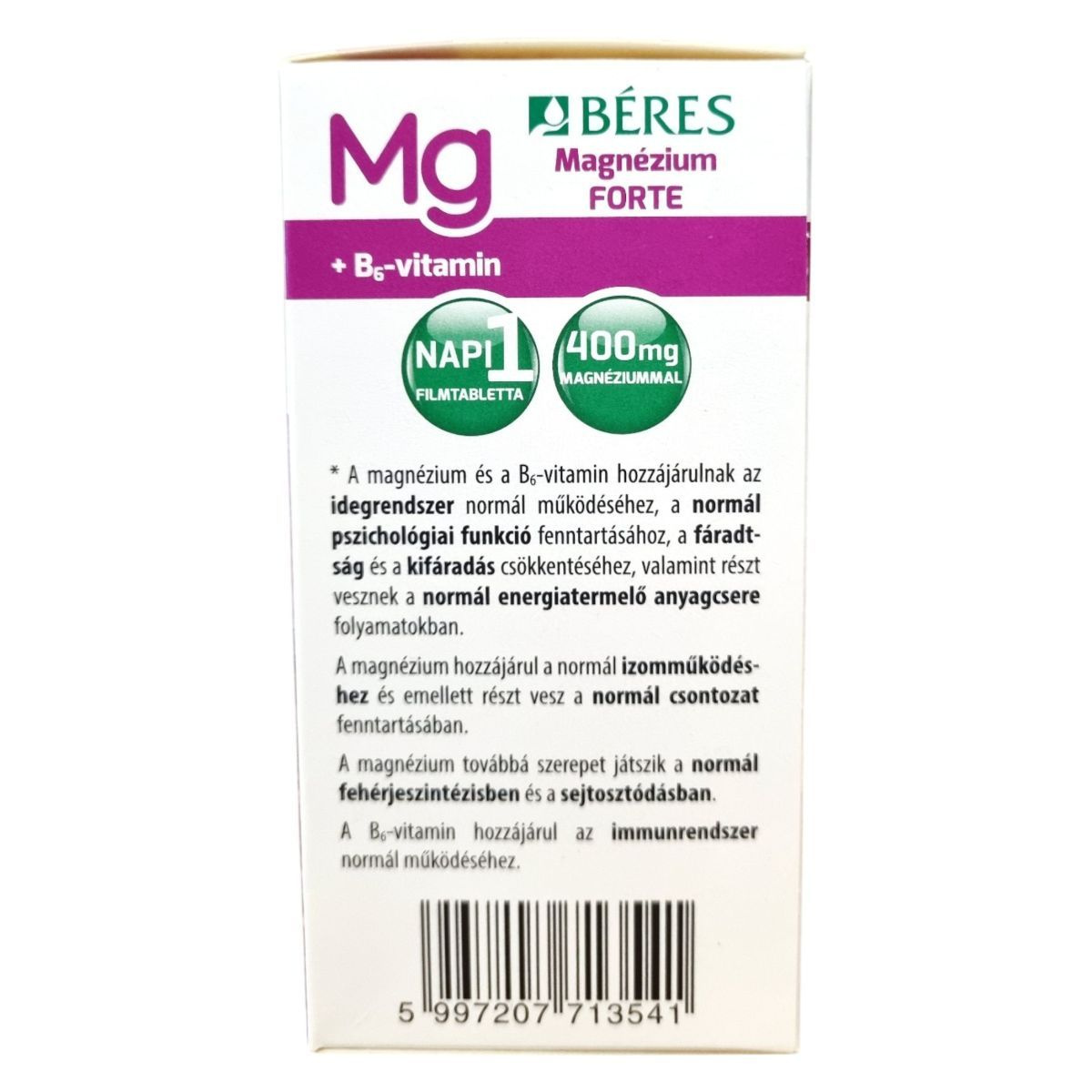 A filmtabletta 400 mg magnéziummal és 2,4 mg B6-vitaminnal segíthet a fáradtság csökkentésében, a normál izomműködés és idegrendszeri egyensúly fenntartásában.
