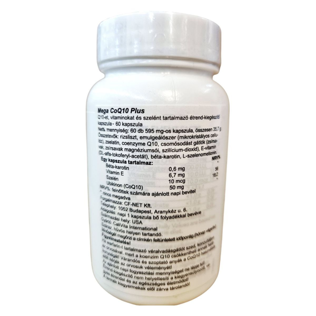 A Mega CoQ10 Plus egy étrend-kiegészítő, amely 60 kapszulát tartalmaz, és Q10-et, vitaminokat, valamint szelént kínál. A termék célja, hogy antioxidáns komplexként támogassa a szervezetet. A koenzim Q10 hozzájárulhat a sejtek energiatermeléséhez, míg az E-vitamin és a szelén az immunrendszer működését támogathatják. A termék forgalmazója a CF-NET Kft., és az USA-ból származik. A kapszulákat száraz, hűvös helyen kell tárolni, és fontos, hogy a gyermekek elől elzárva tartsuk. A termék minőségét a címkén feltüntetett időpontig őrzi meg.
