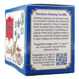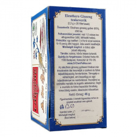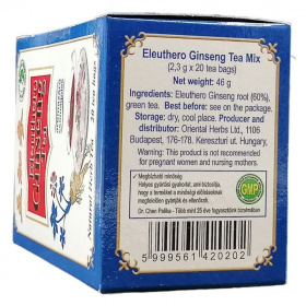 Segíti a relaxációt, használható fáradtság, kimerültség, idegesség esetén. A kínai filozófia szerint az 5 szervrendszer megfelel a világegyetem 5 elemének: immunrendszer-fa; szív-, érrendszer-tűz; emésztőrendszer-föld; légzőszervek-fém; keringés-víz. Ha az elemek harmóniában vannak egymással, egészségesek vagyunk. A harmónia megteremtésében az Eleuthero ginseng nagy segítségünkre lehet. A természetnek ezt a nagyszerű ajándékát évszázadok óta használják a jó kondíció megőrzése érdekében. Az Eleuthero ginseng segít megőrizni a test fizikális és mentális teljesítőképességét, támogatja a normál vérkeringést és az immunrendszert. Segíti a relaxációt, használható fáradtság, kimerültség, idegesség esetén. Naponta 1-2 csésze tea fogyasztása javasolt.