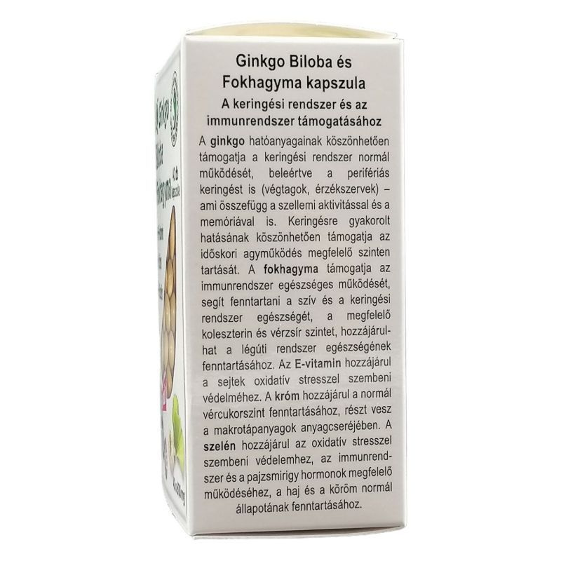 A fokhagyma támogatja az immunrendszer egészséges működését, segít fenntartani a szív és a keringési rendszer egészségét, a megfelelő koleszterin és vérzsír szintet, hozzájárulhat a légúti rendszer egészségének fenntartásához. A zöldtea polifenolok és az E-vitamin antioxidánsként védik a sejteket a szabad gyökök okozta károsító hatásokkal szemben. A króm hozzájárul a normál vércukorszint fenntartásához, részt vesz a makrotápanyagok anyagcseréjében. A szelén hozzájárul az oxidatív stresszel szembeni védelemhez, az immunrendszer és a pajzsmirigy hormonok megfelelő működéséhez, a haj és a köröm normál állapotának fenntartásához. Adagolás (felhasználás): naponta 1-2 kapszula bőséges folyadékkal lenyelve. Összetevők: fokhagyma olajos kivonata, zselatin, Ginkgo Biloba standardizált kivonata, zöldtea polifenol, E-vitamin (tokoferol), krómmal dúsított élesztő, szelénnel dúsított élesztő. Hatóanyagok a napi adagolásra: Hatóanyagok 1 kapszulában: Fokhagyma olajos kivonata 270 mg, Ginkgo Biloba standardizált kivonata 60 mg, zöldtea polifenol 50 mg, E-vitamin (tokoferol) 50mg (NRV 416%), króm 220 µg (NRV 550%), szelén 150 µg (NRV 272%).