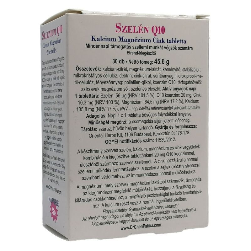 Élesztőből származó szerves szelénnel, a jó hasznosulás érdekében. Szelén a haj, és a köröm, cink a haj, a bőr és a köröm állapotának támogatásához, a sejtek oxidatív stresszel szembeni védelméhez, az immunrendszer normál működéséhez. Cinkkel a normál szellemi működés fenntartásához. Szerves magnézium-laktáttal (531 mg/tabletta), mely biztosítja a szervezetben való kedvező hasznosulást - az idegrendszer támogatásához, a megfelelő pszichológiai funkció fenntartásához, a fáradtság csökkentéséhez. A magnézium mellett kalciummal az izomműködés, a csontok és a fogak normál állapotának fenntartásához. Az étrend-kiegészítő nem helyettesíti a kiegyensúlyozott vegyes étrendet és az egészséges életmódot. Az ajánlott napi adagot ne lépje túl! Gyermekek elől elzárva tartandó. Adagolás (felhasználás) naponta 1 tabletta bőséges folyadékkal lenyelve. Összetevők: kalcium-citrát, magnézium-laktát, keményítő, stabilizátor: mikrokristályos cellulóz, dextrin; cink-citrát, szilárdítóanyag: HPMC, PEG; koenzim Q10, térfogatnövelő: magnézium-sztearát, szelénes élesztő. Hatóanyagok a napi adagolásra: napi 1 tablettára: Szelén: 56 µg (NRV 101,5 %), Q10 koenzim: 20 mg, Cink: 10,3 mg (NRV 103 %), Magnézium: 64,5 mg (NRV 17,2 %), Kalcium: 135,8 mg (NRV 17 %), NRV = felnőttek számára ajánlott napi bevitel.