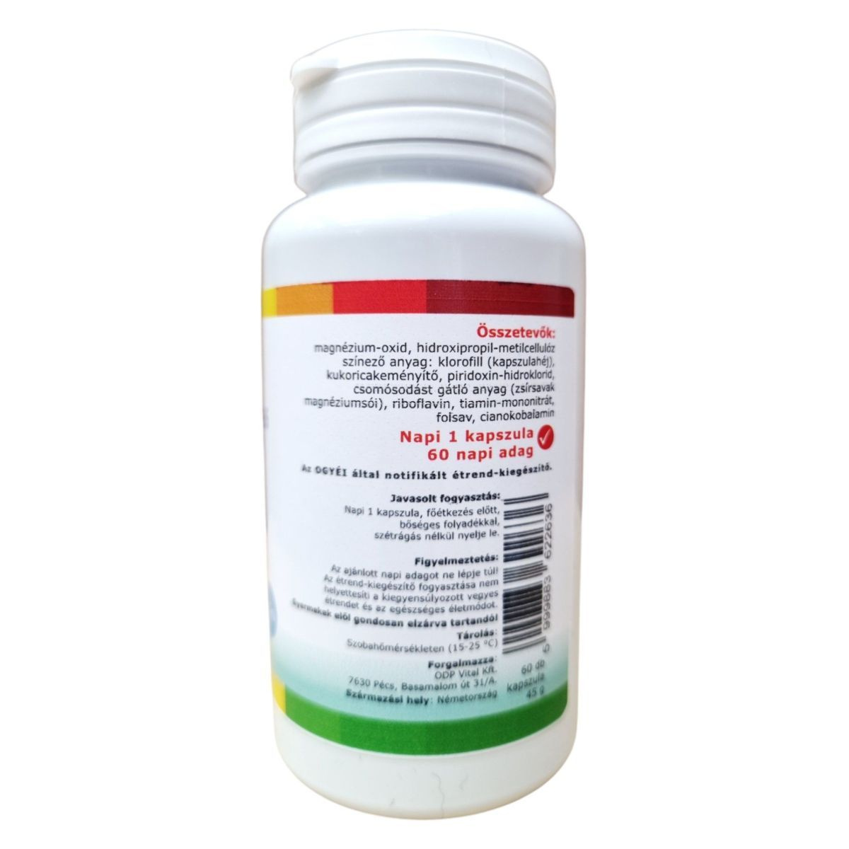 magnézium-oxid, hidroxipropil-metilcellulóz, színező anyag: klorofill (kapszulahéj), kukoricakeményítő, piridoxin-hidroklorid, csomósodást gátló anyag (zsírsavak magnézium sói), riboflavin, tiamin-mononitrát, folsav, cianokobalamin