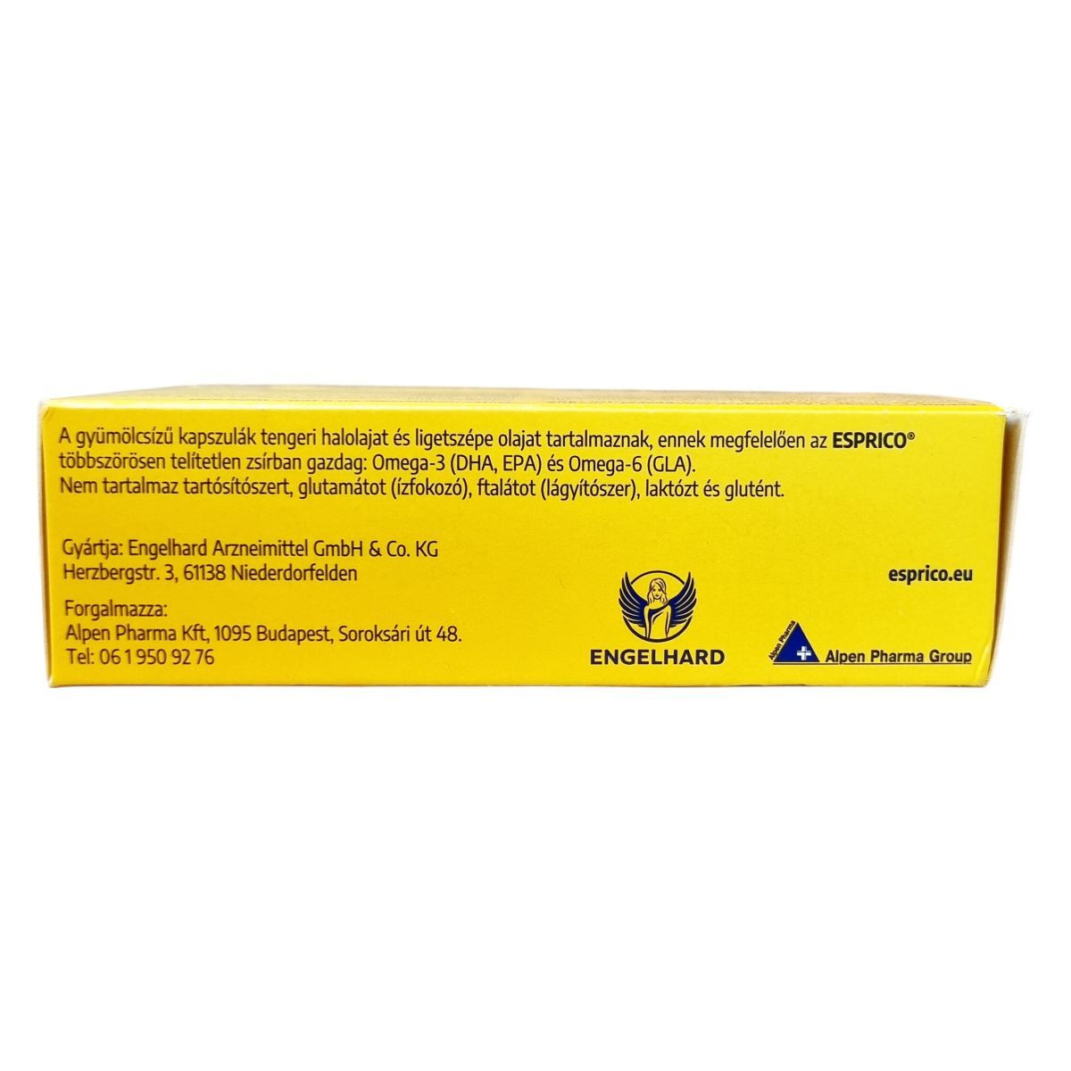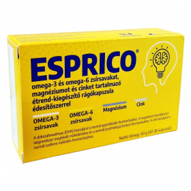 Az ESPRICO® gumírozott kapszulái gyümölcsízűek és többszörösen telítetlen zsírban gazdagok, tartalmaznak omega-3 és omega-6 zsírsavakat, mint a DHA, EPA és GLA. A termék nem tartalmaz tartósítószert, glutamátot, ftalátot, laktózt és glutént. A DHA dokozahexaénsav hozzájárulhat a normál agyműködés fenntartásához, a magnézium pedig az idegrendszer megfelelő működéséhez és a normál pszichológiai funkció fenntartásához. A cink hozzájárulhat a normál szellemi működés fenntartásához. A napi 4 kapszula bevitelével a termék töredékét biztosítja a javasolt 250 mg DHA napi mennyiségnek. Az ESPRICO® fogyasztása során fontos betartani az ajánlott adagolást, és tisztában lenni az allergén összetevőkkel, különösen hal és szójaallergia esetén.